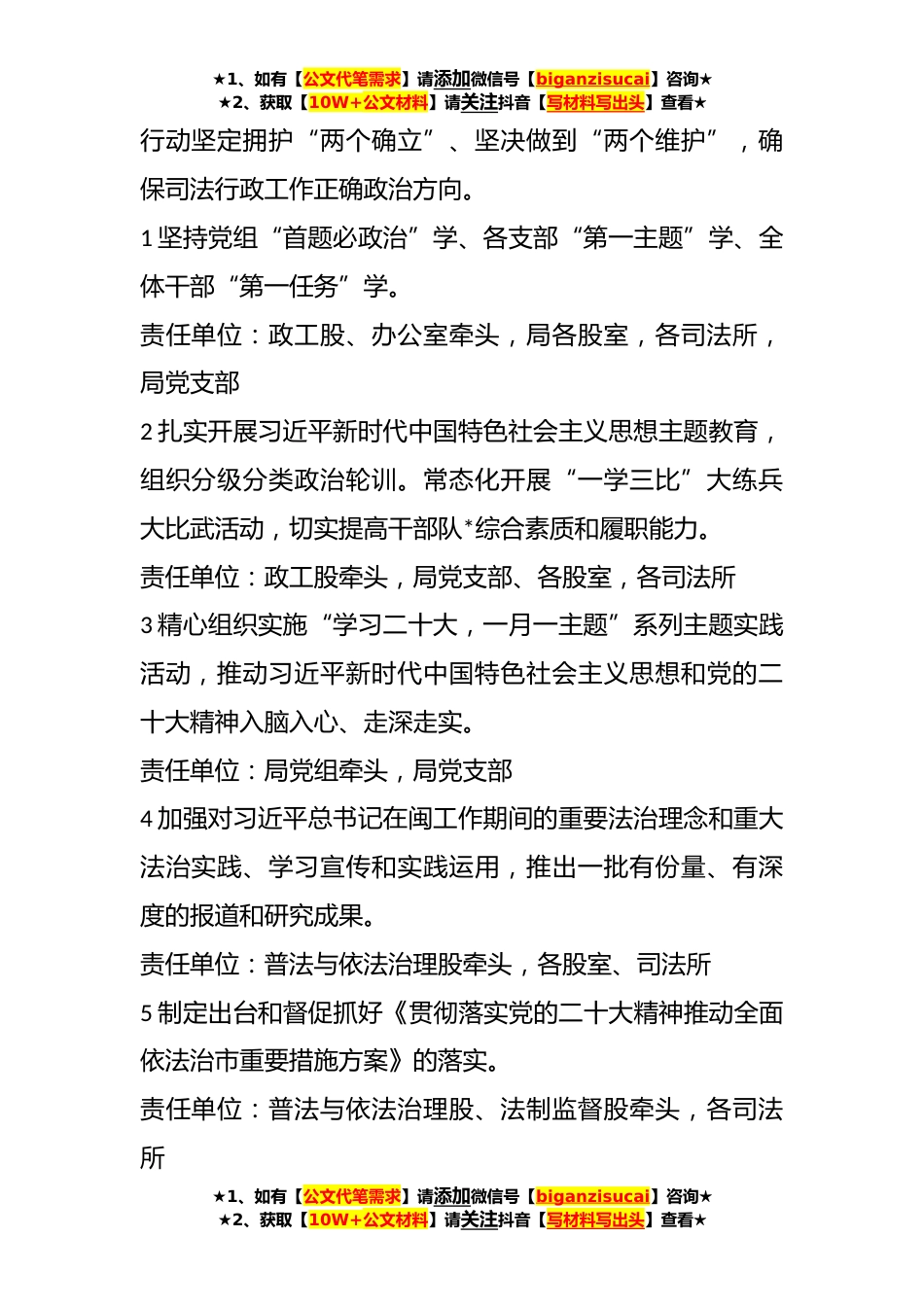 ★1、如有【公文代笔需求】请添加微信号【biganzisucai】咨询★★2、获取【10W+公文材料】请关注抖音【写材料写出头】查看★为贯彻落实省委、*市委、*市司法局党组及*县委部署要求,深入组织实施“深学争优、敢为争先、实干争效”行动,结合我县司法行政工作实际,制定工作方案如下。一、总体要求坚持以习近平新时代中国特色社会主义思想为指导,全面学习、全面把握、全面落实党的二十大精神,深入贯彻习近平总书记对*、*工作的重要讲话重要指示批示精神,认真落实党中央决策和省委、*市委、*县委部署要求,坚持将“深学争优、敢为争先、实干争效”行动作为学习新思想、贯彻新精神、推动新发展的具体实践,始终坚持以加快建设法治政府为目标,以全面推进*各方面工作法治化为主线,紧扣司法行政全年工作目标任务,...