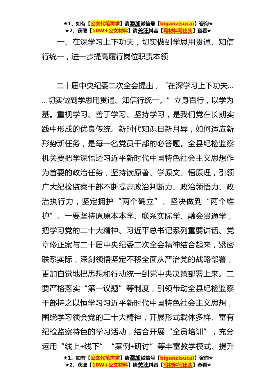 ★1、如有【公文代笔需求】请添加微信号【biganzisucai】咨询★★2、获取【10W+公文材料】请关注抖音【写材料写出头】查看★**年X纪检监察干部队*育整顿研讨发言材料二十届中央纪委二次全会对“锻造堪当新时代新征程重任的高素质纪检监察干部队*做出部署安排,提出“强化能力建设,发扬斗争精神,坚定斗争意志,增强斗争本领用好深学习、实调研、抓落实工作方法,打造敢于善于斗争的纪检监察铁军。”**年是贯彻党的二十大精神的开局之年,是实施“十四五”规划承前启后的关键一年,面对“一刻不停推进全面从严治党,保障党的二十大决策部署贯彻落实”新形势、新任务,全县纪检监察机关将主动用好“深学习、实调研、抓落实”的工作机制和方法,结合纪检监察干部队*育整顿,坚持在深学习中找准调研、落实的目标、方...