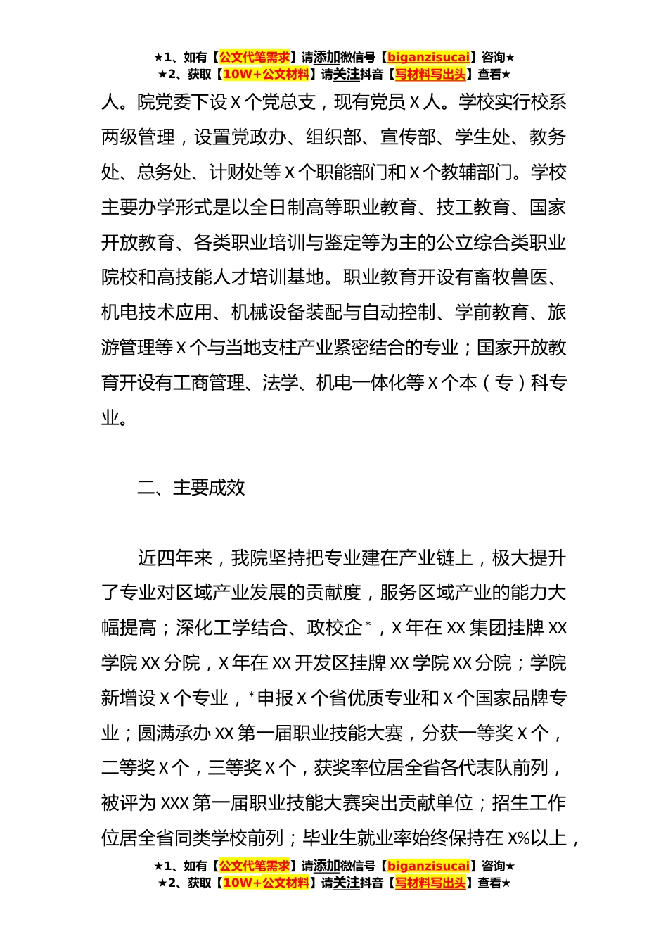 ★1、如有【公文代笔需求】请添加微信号【biganzisucai】咨询★★2、获取【10W+公文材料】请关注抖音【写材料写出头】查看★XX学校巡视巡察整改自查自纠报告为进一步贯彻落实习近平总书记关于巡视工作的重要论述,深化对新时代巡视巡察工作内涵要求的理解把握,以高质量巡察推动全面从严治党向纵深发展。根据省委巡察工作统一部署,我院坚持以习近平新时代社会主义思想为指导,深入贯彻落实巡视工作方针和省委巡察工作要求围绕“三个聚焦”,从严从实开展全面自查。现将自查情况报告如下。一、基本情况学院始建于X年,其前身是原XX职工大学,X年X月经XX省人民政府批准更名为XXX职业大学,X年X月经XX省人民政府同意设立XX职业技术学院。学校占地X亩,建筑面积X万平方米,图书馆藏书X万册。现有教职工X人,其中专任...