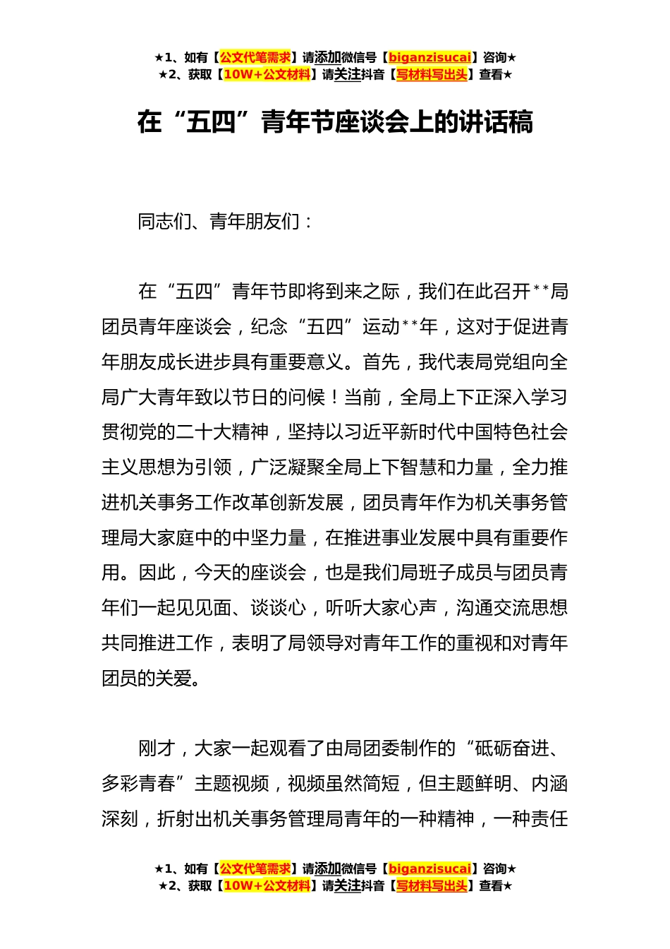 ★1、如有【公文代笔需求】请添加微信号【biganzisucai】咨询★★2、获取【10W+公文材料】请关注抖音【写材料写出头】查看★在“五四”青年节座谈会上的讲话稿同志们、青年朋友们:在“五四”青年节即将到来之际,我们在此召开**局团员青年座谈会,纪念“五四”运动**年,这对于促进青年朋友成长进步具有重要意义。首先,我代表局党组向全局广大青年致以节日的问候!当前,全局上下正深入学习贯彻党的二十大精神,坚持以习近平新时代中国特色社会主义思想为引领,广泛凝聚全局上下智慧和力量,全力推进机关事务工作改革创新发展,团员青年作为机关事务管理局大家庭中的中坚力量,在推进事业发展中具有重要作用。因此,今天的座谈会,也是我们局班子成员与团员青年们一起见见面、谈谈心,听听大家心声,沟通交流思...