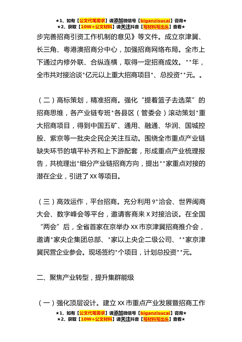 ★1、如有【公文代笔需求】请添加微信号【biganzisucai】咨询★★2、获取【10W+公文材料】请关注抖音【写材料写出头】查看★关于XX全省重点园区产业链发展和招商现场调研座谈会汇报材料近年来;在省委、省政府的正确领导下,在省直部门的指导帮助下,XX市以“深学争优、敢为争先、实干争效”行动为重要抓手,始终坚持把发展经济的着力点放在实体经济上,深度融入全省现代化产业体系,俯下身子抓产业、一心一意谋发展,聚焦发力*条重点产业链,强化招商引资,推进开发区改革和创新发展,优存量、促增量、增总量、提质量,加快提升全市产业基础能力和产业链现代化水平产业高质量发展成效显著。一、聚力招商引资,增强发展后劲(一)高位推动,顶格招商。成立XX市招商引资工作领导小组,由市委、市政府主要领导任组长...