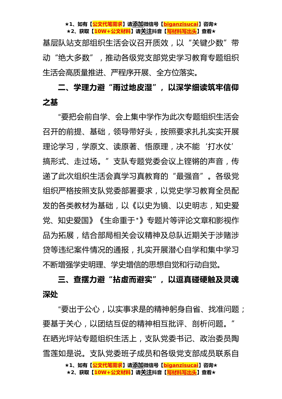 ★1、如有【公文代笔需求】请添加微信号【biganzisucai】咨询★★2、获取【10W+公文材料】请关注抖音【写材料写出头】查看★关于学校样板党支部创建典型经验材料(*)关于学校样板党支部创建典型经验材料*百年征程波澜壮阔,百年初心历久弥坚。在即将迎来中国共产党百年华诞之际,特勤支队各级党支部严格按照总队、支队党委部署,积极召开“党史学习教育”专题组织生活会,教育引领全体指战员学党史、悟思想、办实事、开新局,以昂扬的姿态全力投入建党百年消防安保。一、统筹力避“自行无章法”,以党委统领强化顶层设计党史学习教育活动开展以来,支队党委坚持早谋划、早着手、早发力,本着“压实规定动作不走样、推进特色做法重实效、深化学以致用促工作”的思路,将各级党支部专题组织生活会作为党史学习教育...