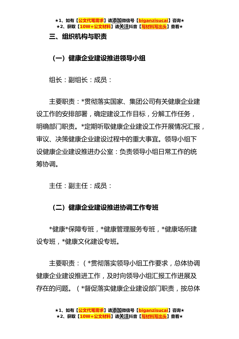 ★1、如有【公文代笔需求】请添加微信号【biganzisucai】咨询★★2、获取【10W+公文材料】请关注抖音【写材料写出头】查看★健康企业建设实施方案为全面贯彻落实《×××》《×××》《×××》,进一步加快推进健康企业建设,提升×××公司健康管理水*员工健康素养,制定本方案。一、指导思想坚持以习近平新时代中国特色社会主义思想为指导,认真贯彻落实党的XX大推进健康中国建设的总要求,按照集团公司关于健康企业建设工作的总体部署,牢固树立“把员工生命安全和身心健康放在第一位”的理念,全力打造健康管理机制健全、环境优良、文化领先的健康企业,确保员工健康水平持续提升,主要健康危险因素得到有效控制,让×××高质量发展成果惠及全体×××员工。二、工作目标**年,健康管理各项工作快速推进,全...