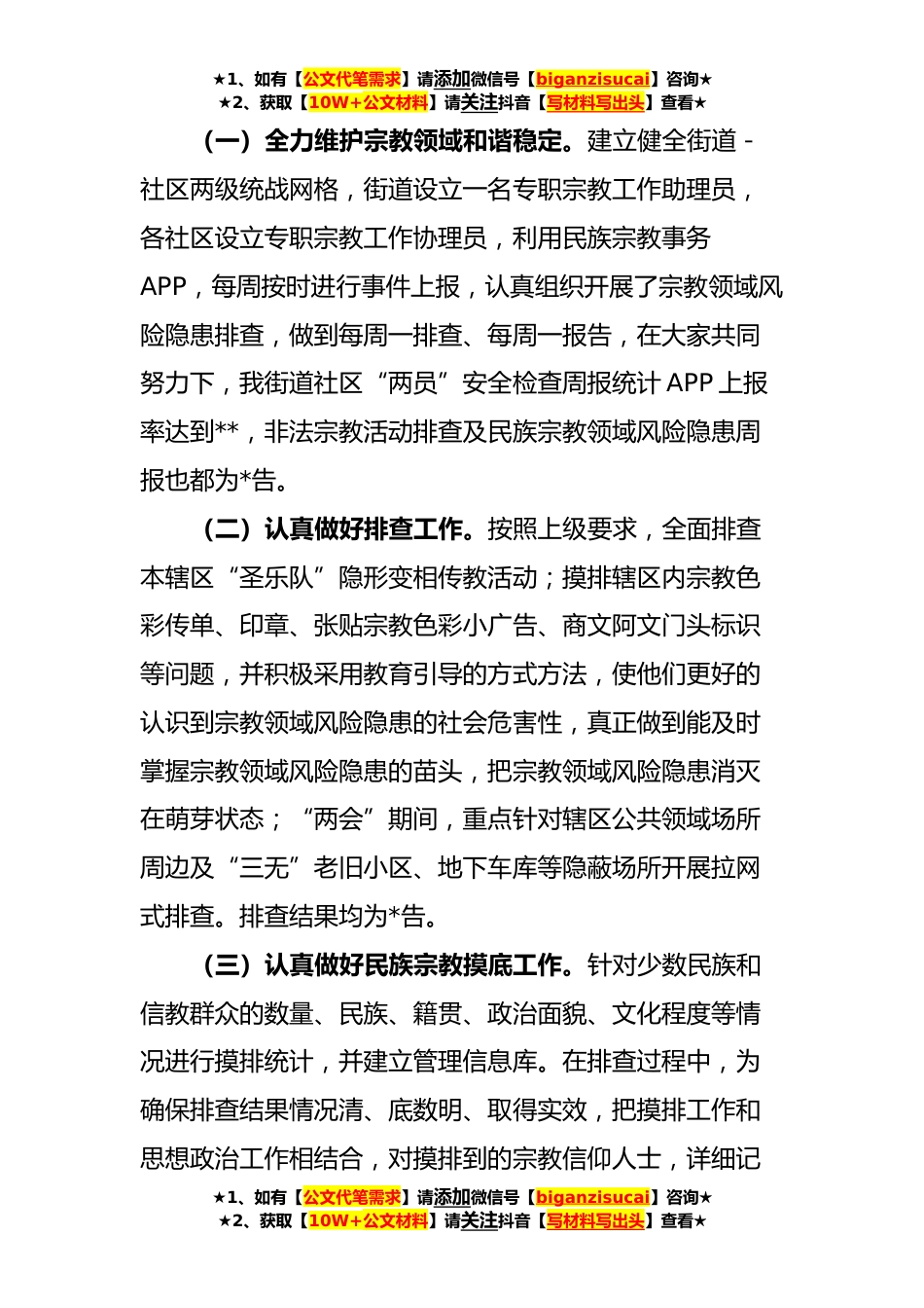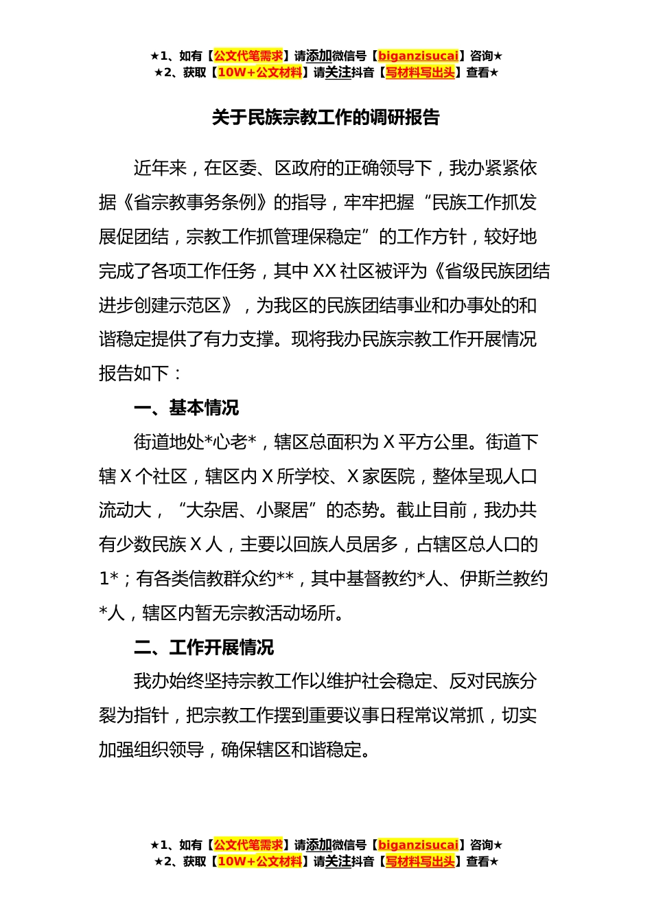 ★1、如有【公文代笔需求】请添加微信号【biganzisucai】咨询★★2、获取【10W+公文材料】请关注抖音【写材料写出头】查看★关于民族宗教工作的调研报告近年来,在区委、区政府的正确领导下,我办紧紧依据《省宗教事务条例》的指导,牢牢把握“民族工作抓发展促团结,宗教工作抓管理保稳定”的工作方针,较好地完成了各项工作任务,其中XX社区被评为《省级民族团结进步创建示范区》,为我区的民族团结事业和办事处的和谐稳定提供了有力支撑。现将我办民族宗教工作开展情况报告如下:一、基本情况街道地处*心老*,辖区总面积为X平方公里。街道下辖X个社区,辖区内X所学校、X家医院,整体呈现人口流动大,“大杂居、小聚居”的态势。截止目前,我办共有少数民族X人,主要以回族人员居多,占辖区总人口的1*;有各类信...