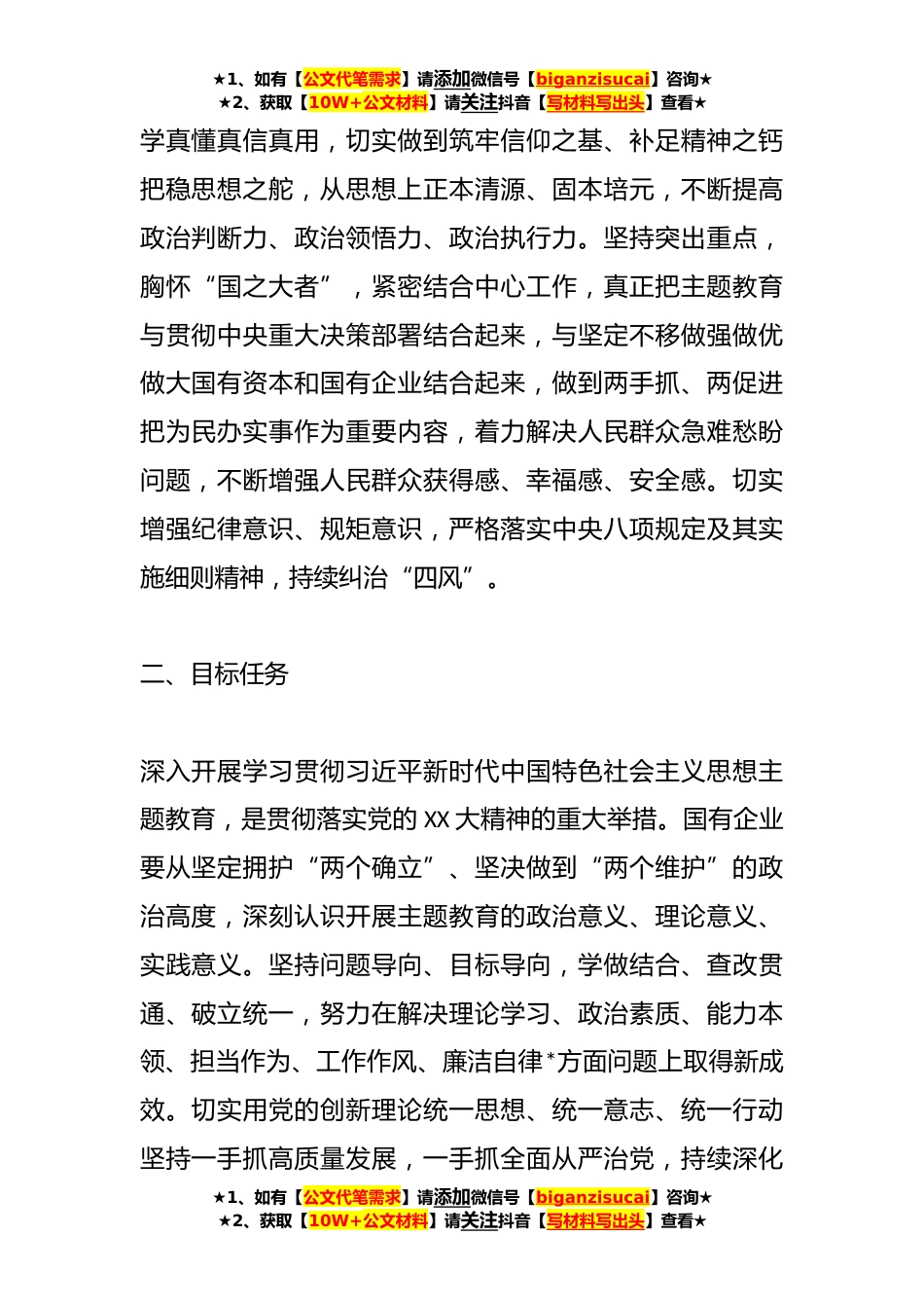 ★1、如有【公文代笔需求】请添加微信号【biganzisucai】咨询★★2、获取【10W+公文材料】请关注抖音【写材料写出头】查看★**年X国有企业关于学习贯彻主题教育的实施方案按照X国资委党委关于开展学习贯彻习近平新时代中国特色社会主义思想主题教育工作的相关通知要求,根据X委在X范围内开展主题教育的具体安排部署,牢牢把握“学思想强党性、重实践、建新功”总要求,注重抓好“五个突出”、提升“七种能力”,扎实推进X企主题教育各项任务,以党员干部作风新面貌推动X企高质量发展新局面。结合公司实际情况,特制定如下实施方案。一、总体要求全面落实中央主题教育“学思想、强党性、重实践、建新功”总要求,结合国资国企实际,着力提高主题教育工作质量。深入学习领会习近平总新时代中国特色社会主义思想,牢...