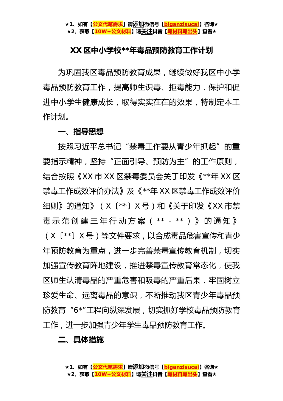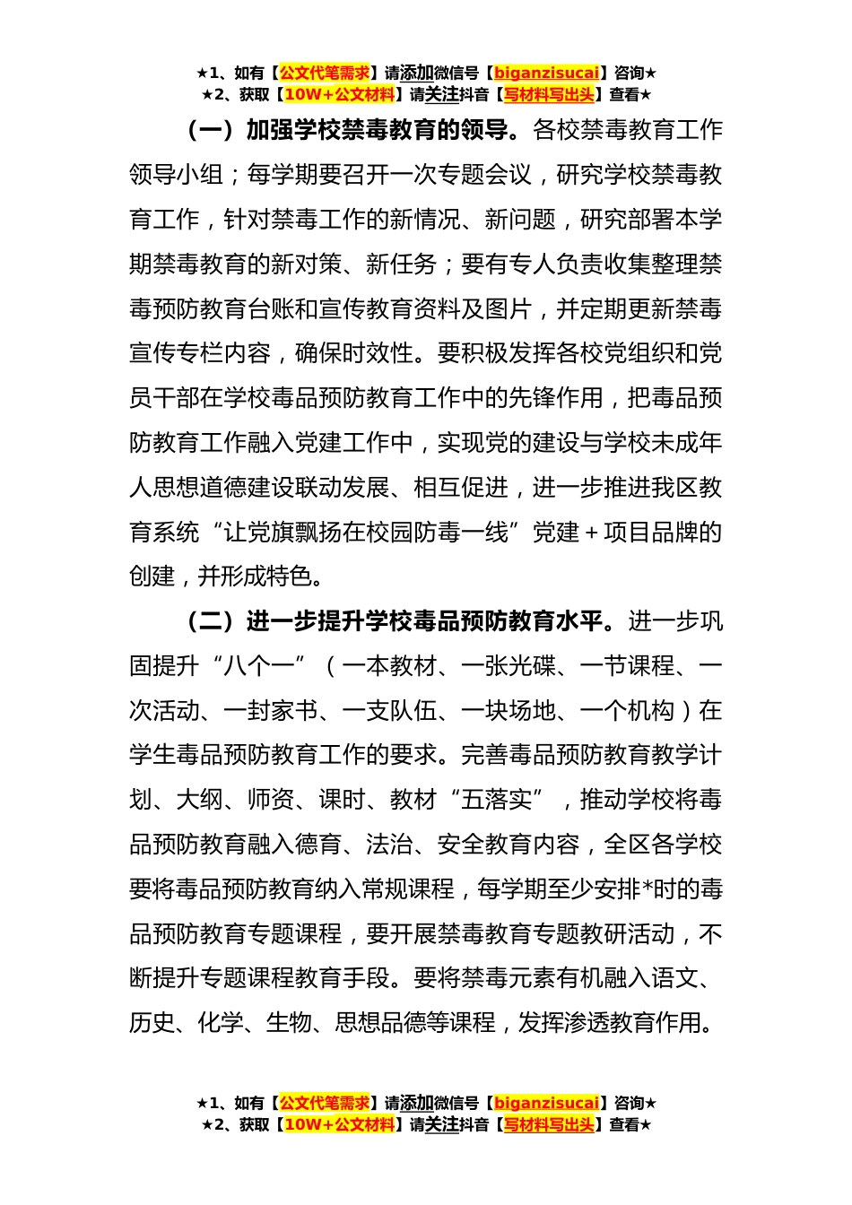 ★1、如有【公文代笔需求】请添加微信号【biganzisucai】咨询★★2、获取【10W+公文材料】请关注抖音【写材料写出头】查看★XX区中小学校**年毒品预防教育工作计划为巩固我区毒品预防教育成果,继续做好我区中小学毒品预防教育工作,提高师生识毒、拒毒能力,保护和促进中小学生健康成长,取得实实在在的效果,特制定本工作计划。一、指导思想按照习近平总书记“禁毒工作要从青少年抓起”的重要指示精神,坚持“正面引导、预防为主”的工作原则,结合按照《XX市XX区禁毒委员会关于印发《**年XX区禁毒工作成效评价办法》及《**年XX区禁毒工作成效评价细则》的通知》(X〔**〕X号)和《关于印发《XX市禁毒示范创建三年行动方案(**-**)》的通知》(X〔**〕X号)等文件要求,以合成毒品危害宣传和青少年预防教育为...