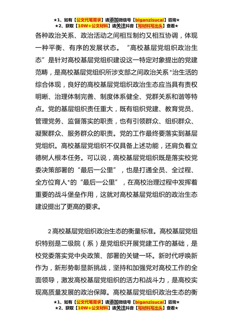 ★1、如有【公文代笔需求】请添加微信号【biganzisucai】咨询★★2、获取【10W+公文材料】请关注抖音【写材料写出头】查看★XX学校基层党组织政治生态建设特色材料构建良好的政治生态是新形势下全面推进从严治党在高校领域的必然要求,也是高校推进治理体系和治理能力现代化的理性选择。高校基层党组织是学校内部治理体系中的关键一环,是党的基层组织履行高等教育职能的保障力量。中国红十字会是党*府在人道领域联系群众的桥梁和纽带,密切关注群众利益,高度重视党群关系,高校党建工作可积极挖掘红十字会党群关系的文化基因,以涵养高校基层党组织政治生态建设。一、高校基层党组织政治生态的语义阐释及衡量标准1高校基层党组织政治生态的语义阐释。“高校基层党组织”是党的基层组织的一个部分,是高校党建工...