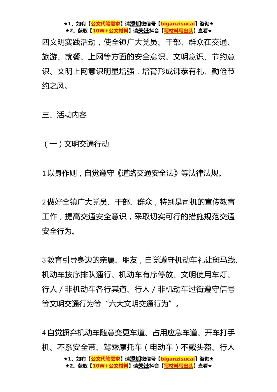 ★1、如有【公文代笔需求】请添加微信号【biganzisucai】咨询★★2、获取【10W+公文材料】请关注抖音【写材料写出头】查看★关于开展“文明交通、文明餐桌、文明上网、文明旅游”实施方案为进一步巩固文明创建成果,增强创建工作实效,积极培育良好社会风尚,提高公民文明素质,提升社会文明程度结合华西镇工作实际,制定如下实施方案。一、指导思想大力培育和践行社会主义核心价值观,弘*华民族传统美德,坚持以人为本、创建为民,坚持教育引导、严格管理并举以文明镇创建为抓手,以劝导和纠正各类不文明行为为重点,树立新风尚,全面提高全镇广大党员、干部、群众的文明素质,提升社会文明程度。二、活动目标通过开展“文明交通、文明餐桌、文明上网、文明旅游”★1、如有【公文代笔需求】请添加微信号【biganzi...