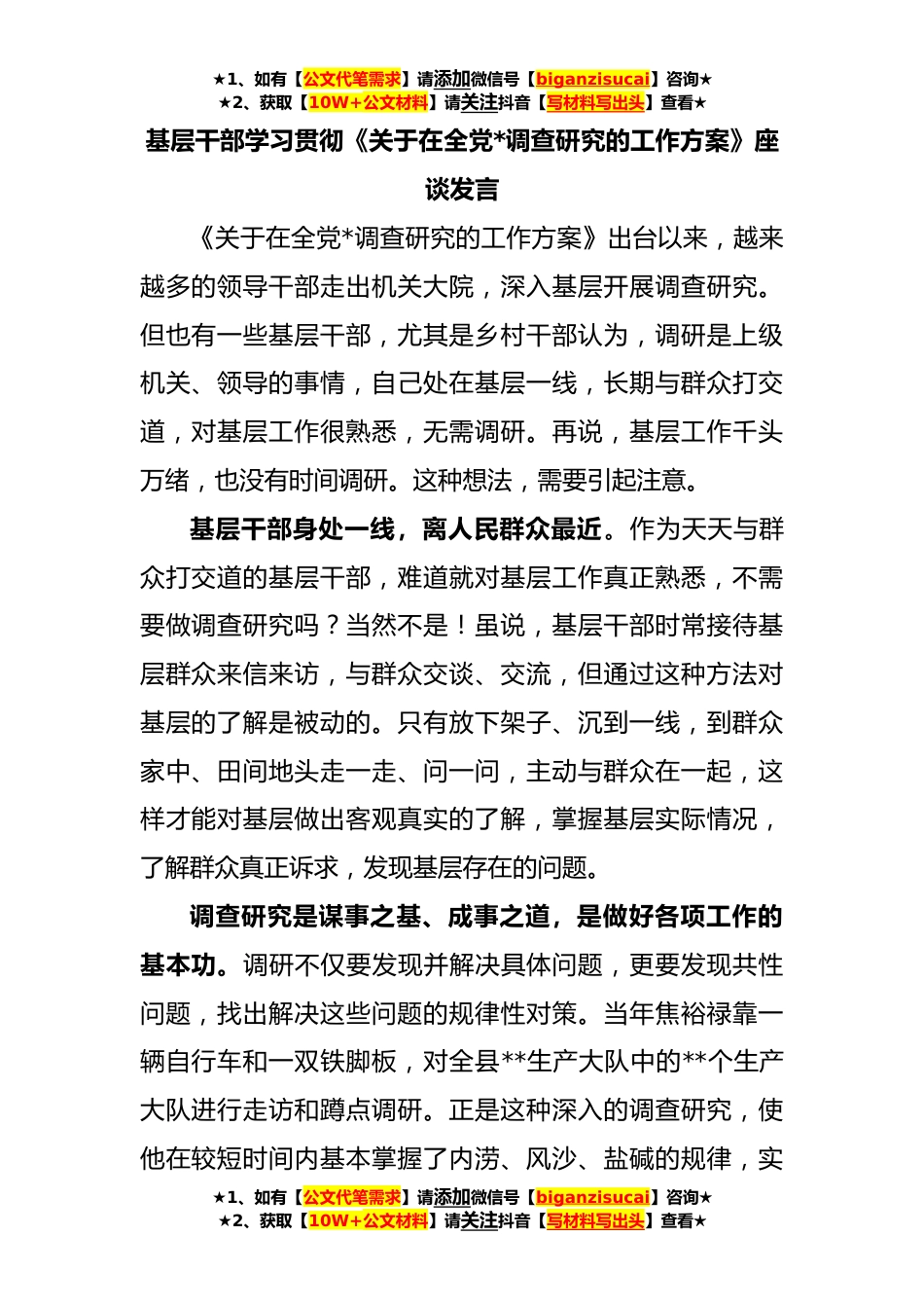 ★1、如有【公文代笔需求】请添加微信号【biganzisucai】咨询★★2、获取【10W+公文材料】请关注抖音【写材料写出头】查看★基层干部学习贯彻《关于在全党*调查研究的工作方案》座谈发言《关于在全党*调查研究的工作方案》出台以来,越来越多的领导干部走出机关大院,深入基层开展调查研究。但也有一些基层干部,尤其是乡村干部认为,调研是上级机关、领导的事情,自己处在基层一线,长期与群众打交道,对基层工作很熟悉,无需调研。再说,基层工作千头万绪,也没有时间调研。这种想法,需要引起注意。基层干部身处一线,离人民群众最近。作为天天与群众打交道的基层干部,难道就对基层工作真正熟悉,不需要做调查研究吗?当然不是!虽说,基层干部时常接待基层群众来信来访,与群众交谈、交流,但通过这种方法对...