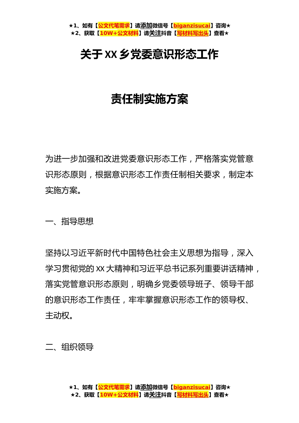 ★1、如有【公文代笔需求】请添加微信号【biganzisucai】咨询★★2、获取【10W+公文材料】请关注抖音【写材料写出头】查看★关于XX乡党委意识形态工作责任制实施方案为进一步加强和改进党委意识形态工作,严格落实党管意识形态原则,根据意识形态工作责任制相关要求,制定本实施方案。一、指导思想坚持以习近平新时代中国特色社会主义思想为指导,深入学习贯彻党的XX大精神和习近平总书记系列重要讲话精神,落实党管意识形态原则,明确乡党委领导班子、领导干部的意识形态工作责任,牢牢掌握意识形态工作的领导权、主动权。二、组织领导★1、如有【公文代笔需求】请添加微信号【biganzisucai】咨询★★2、获取【10W+公文材料】请关注抖音【写材料写出头】查看★★1、如有【公文代笔需求】请添加微信号【biganzisuc...