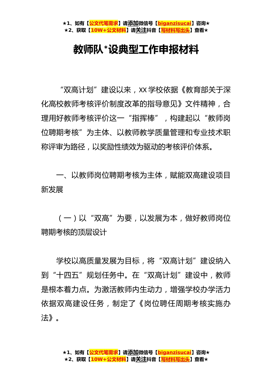 ★1、如有【公文代笔需求】请添加微信号【biganzisucai】咨询★★2、获取【10W+公文材料】请关注抖音【写材料写出头】查看★教师队*设典型工作申报材料“双高计划”建设以来,XX学校依据《教育部关于深化高校教师考核评价制度改革的指导意见》文件精神,合理用好教师考核评价这一“指挥棒”,构建起以“教师岗位聘期考核”为主体、以教师教学质量管理和专业技术职称评审为路径,以奖励性绩效为驱动的考核评价体系。一、以教师岗位聘期考核为主体,赋能双高建设项目新发展(一)以“双高”为要,以发展为本,做好教师岗位聘期考核的顶层设计学校以高质量发展为目标,将“双高计划”建设纳入到“十四五”规划任务中。在“双高计划”建设中,教师是根本着力点。为激活教师内生动力,增强学校办学活力依据双高建设任务...