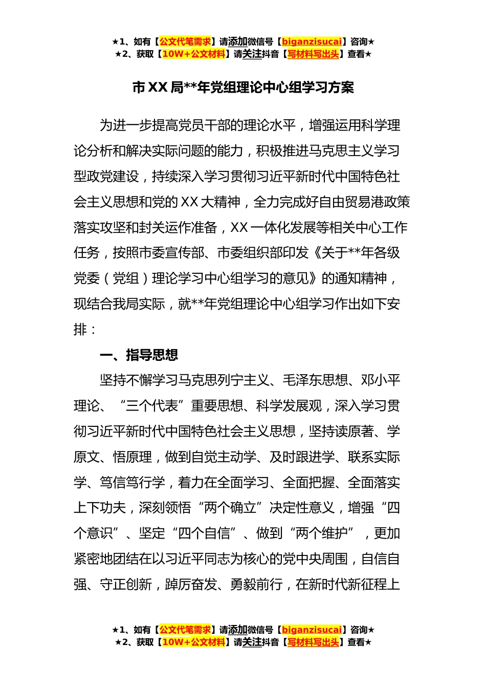 ★1、如有【公文代笔需求】请添加微信号【biganzisucai】咨询★★2、获取【10W+公文材料】请关注抖音【写材料写出头】查看★市XX局**年党组理论中心组学习方案为进一步提高党员干部的理论水平,增强运用科学理论分析和解决实际问题的能力,积极推进马克思主义学习型政党建设,持续深入学习贯彻习近平新时代中国特色社会主义思想和党的XX大精神,全力完成好自由贸易港政策落实攻坚和封关运作准备,XX一体化发展等相关中心工作任务,按照市委宣传部、市委组织部印发《关于**年各级党委(党组)理论学习中心组学习的意见》的通知精神,现结合我局实际,就**年党组理论中心组学习作出如下安排:一、指导思想坚持不懈学习马克思列宁主义、毛泽东思想、邓小平理论、“三个代表”重要思想、科学发展观,深入学习贯彻习近...