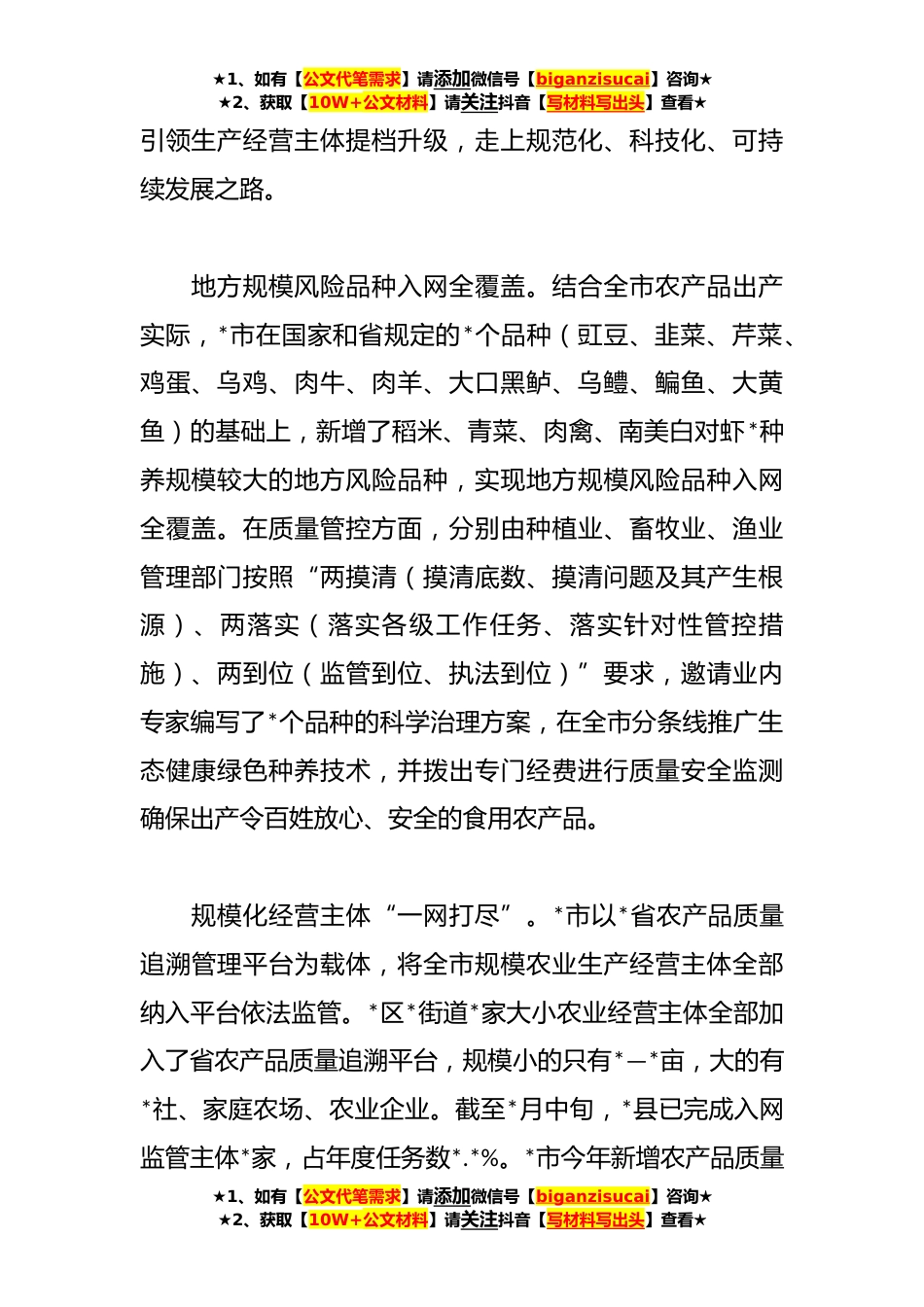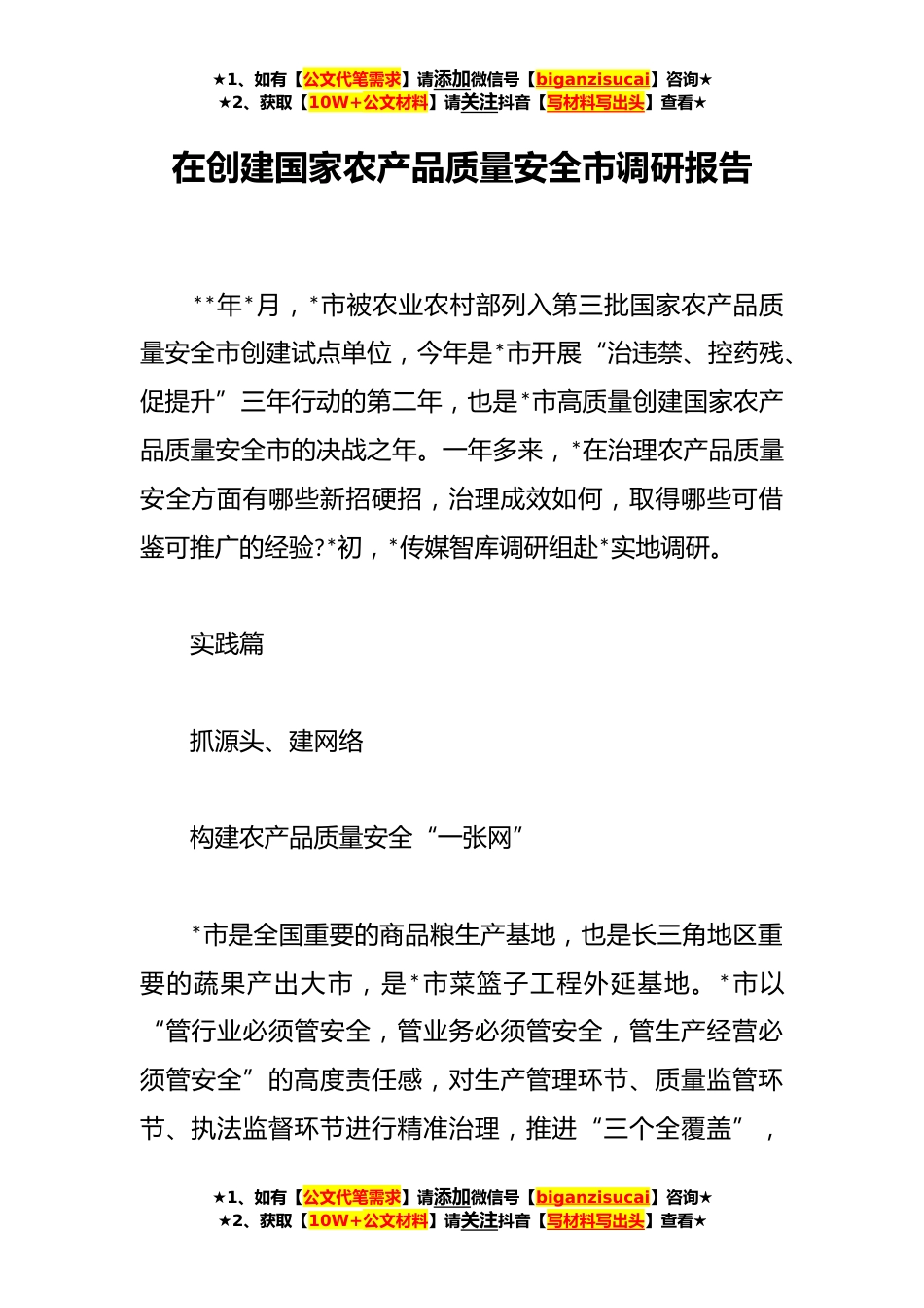 ★1、如有【公文代笔需求】请添加微信号【biganzisucai】咨询★★2、获取【10W+公文材料】请关注抖音【写材料写出头】查看★在创建国家农产品质量安全市调研报告**年*月,*市被农业农村部列入第三批国家农产品质量安全市创建试点单位,今年是*市开展“治违禁、控药残、促提升”三年行动的第二年,也是*市高质量创建国家农产品质量安全市的决战之年。一年多来,*在治理农产品质量安全方面有哪些新招硬招,治理成效如何,取得哪些可借鉴可推广的经验?*初,*传媒智库调研组赴*实地调研。实践篇抓源头、建网络构建农产品质量安全“一张网”*市是全国重要的商品粮生产基地,也是长三角地区重要的蔬果产出大市,是*市菜篮子工程外延基地。*市以“管行业必须管安全,管业务必须管安全,管生产经营必须管安全”的高度责任...