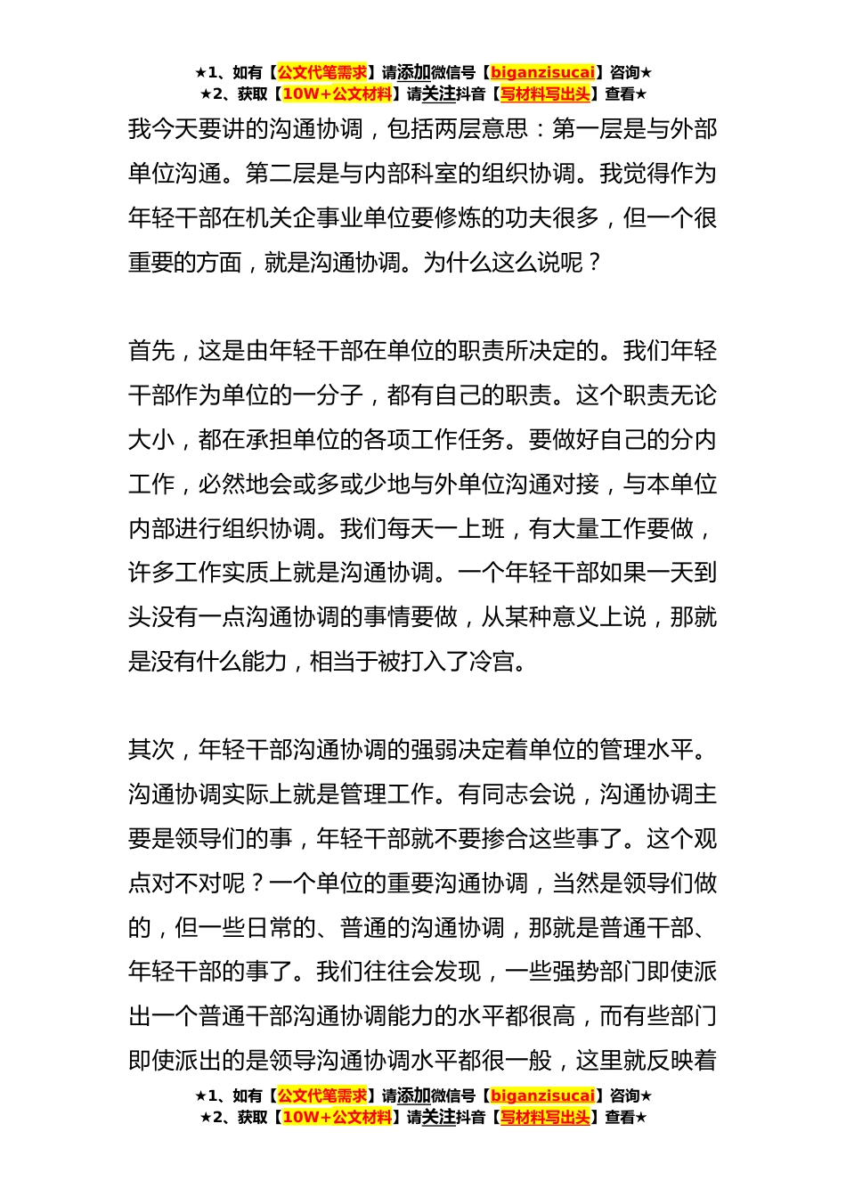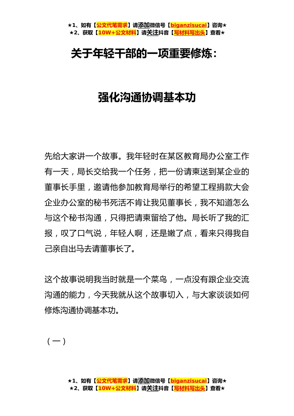 ★1、如有【公文代笔需求】请添加微信号【biganzisucai】咨询★★2、获取【10W+公文材料】请关注抖音【写材料写出头】查看★关于年轻干部的一项重要修炼:强化沟通协调基本功先给大家讲一个故事。我年轻时在某区教育局办公室工作有一天,局长交给我一个任务,把一份请柬送到某企业的董事长手里,邀请他参加教育局举行的希望工程捐款大会企业办公室的秘书死活不肯让我见董事长,我不知道怎么与这个秘书沟通,只得把请柬留给了他。局长听了我的汇报,叹了口气说,年轻人啊,还是嫩了点,看来只得我自己亲自出马去请董事长了。这个故事说明我当时就是一个菜鸟,一点没有跟企业交流沟通的能力,今天我就从这个故事切入,与大家谈谈如何修炼沟通协调基本功。(一)★1、如有【公文代笔需求】请添加微信号【biganzisucai...