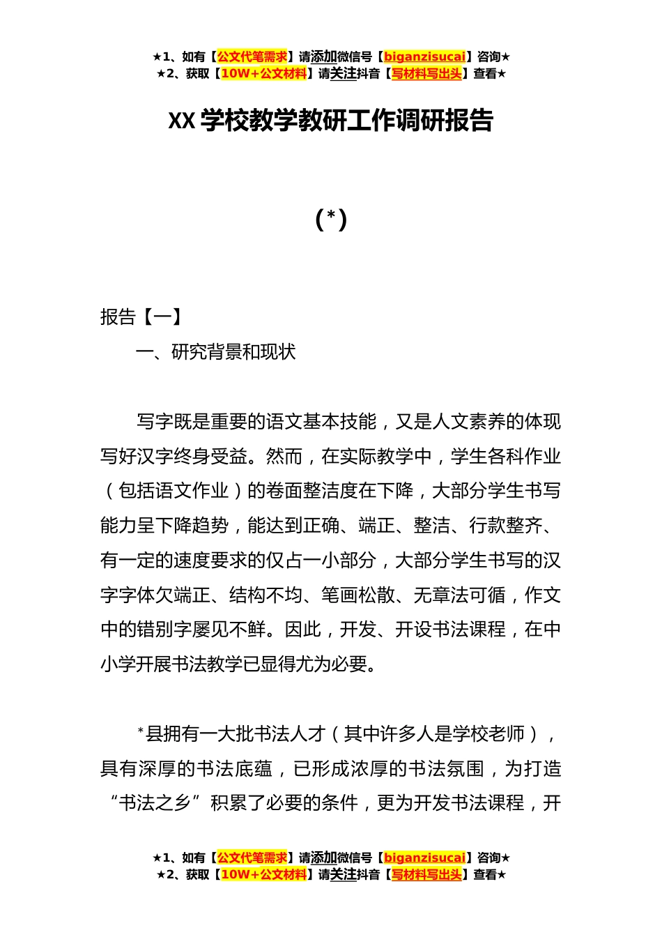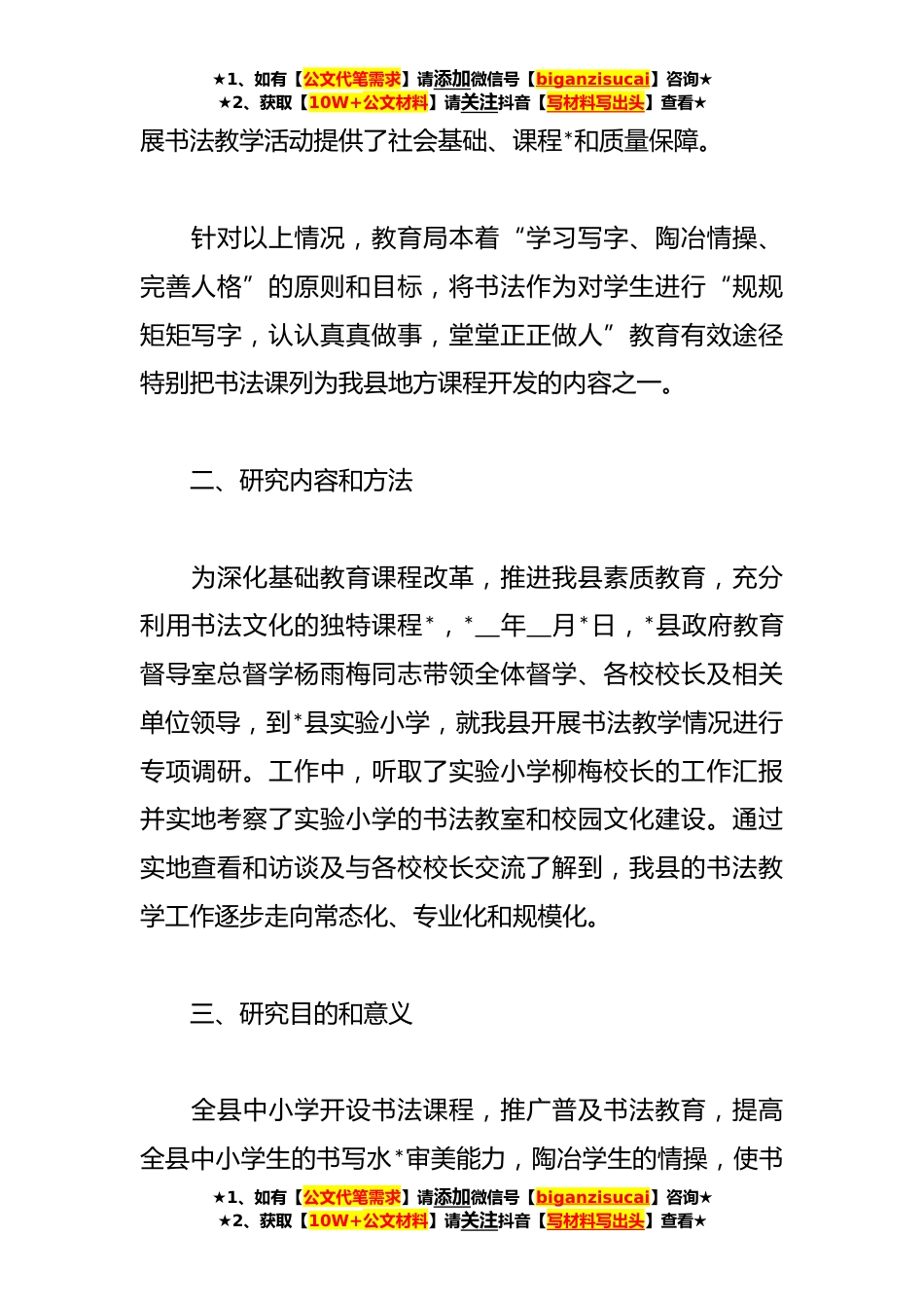 ★1、如有【公文代笔需求】请添加微信号【biganzisucai】咨询★★2、获取【10W+公文材料】请关注抖音【写材料写出头】查看★XX学校教学教研工作调研报告(*)报告【一】一、研究背景和现状写字既是重要的语文基本技能,又是人文素养的体现写好汉字终身受益。然而,在实际教学中,学生各科作业(包括语文作业)的卷面整洁度在下降,大部分学生书写能力呈下降趋势,能达到正确、端正、整洁、行款整齐、有一定的速度要求的仅占一小部分,大部分学生书写的汉字字体欠端正、结构不均、笔画松散、无章法可循,作文中的错别字屡见不鲜。因此,开发、开设书法课程,在中小学开展书法教学已显得尤为必要。*县拥有一大批书法人才(其中许多人是学校老师),具有深厚的书法底蕴,已形成浓厚的书法氛围,为打造“书法之乡”积...