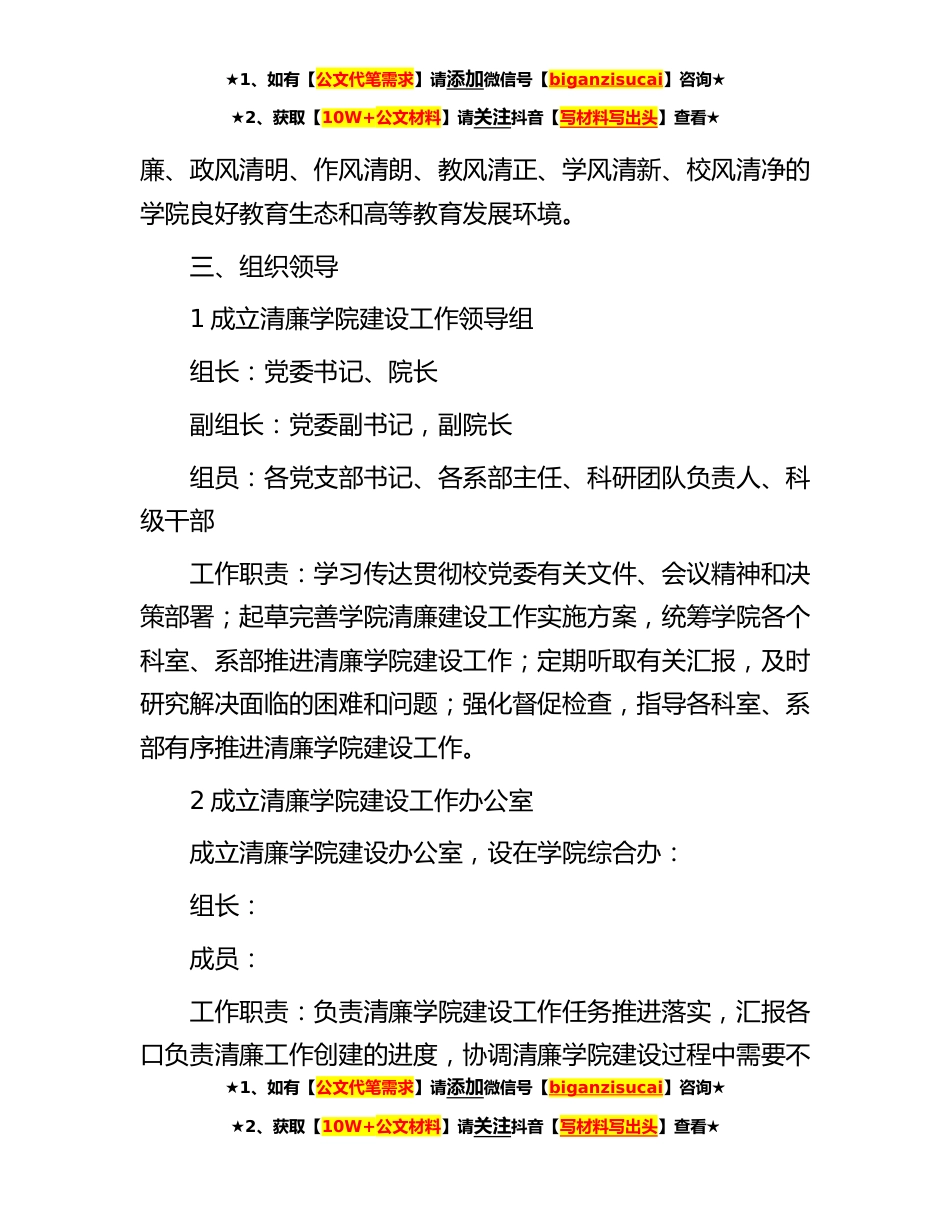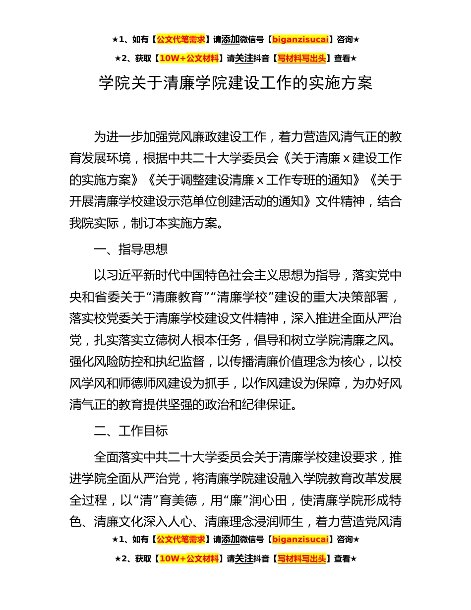 ★1、如有【公文代笔需求】请添加微信号【biganzisucai】咨询★★2、获取【10W+公文材料】请关注抖音【写材料写出头】查看★学院关于清廉学院建设工作的实施方案为进一步加强党风廉政建设工作,着力营造风清气正的教育发展环境,根据中共二十大学委员会《关于清廉x建设工作的实施方案》《关于调整建设清廉x工作专班的通知》《关于开展清廉学校建设示范单位创建活动的通知》文件精神,结合我院实际,制订本实施方案。一、指导思想以习近平新时代中国特色社会主义思想为指导,落实党中“”“”央和省委关于清廉教育清廉学校建设的重大决策部署,落实校党委关于清廉学校建设文件精神,深入推进全面从严治党,扎实落实立德树人根本任务,倡导和树立学院清廉之风。强化风险防控和执纪监督,以传播清廉价值理念为核心,...