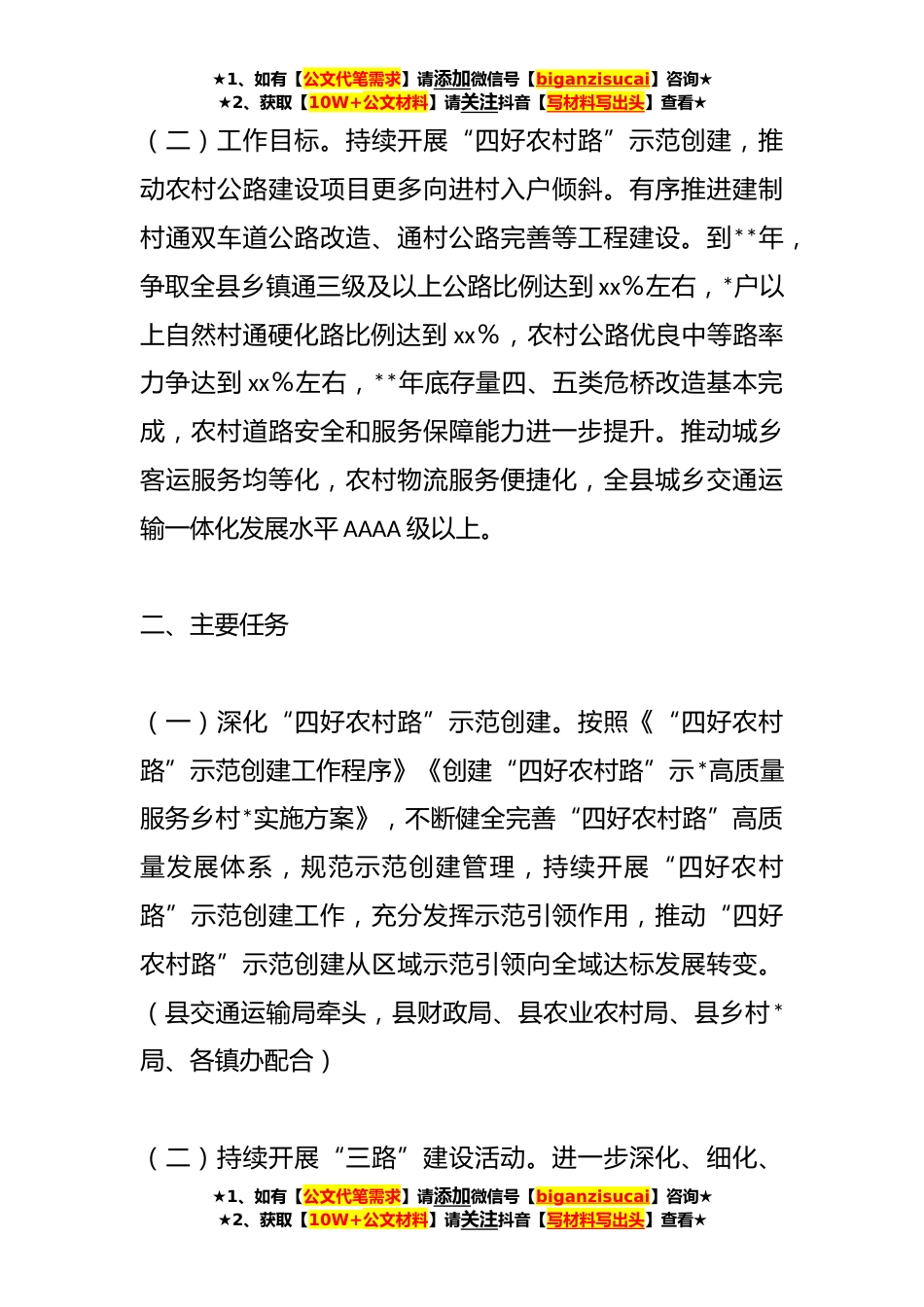 ★1、如有【公文代笔需求】请添加微信号【biganzisucai】咨询★★2、获取【10W+公文材料】请关注抖音【写材料写出头】查看★XX县农村道路畅通工程推进方案为深入贯彻落实中省县关于乡村建设系列决策部署,按照有关文件要求,进一步细化我县农村道路畅通工程目标任务和实施安排,结合我县实际,制定本方案。一、总体要求(一)指导思想。以习近平新时代中国特色社会主义思想为指导,全面贯彻落实党的XX大精神,深入学习贯彻习近平总书记关于“三农”工作重要论述和来陕考察重要讲话重要指示批示精神,坚持以人民为中心的发展思想,立足新发展阶段、贯彻新发展理念、构建新发展格局,把农村交通基础设施建设摆在重要位置,发挥农村交通运输的基础性、先导性、战略性和服务性作用,统筹发展和安全,稳步推进“四好农...