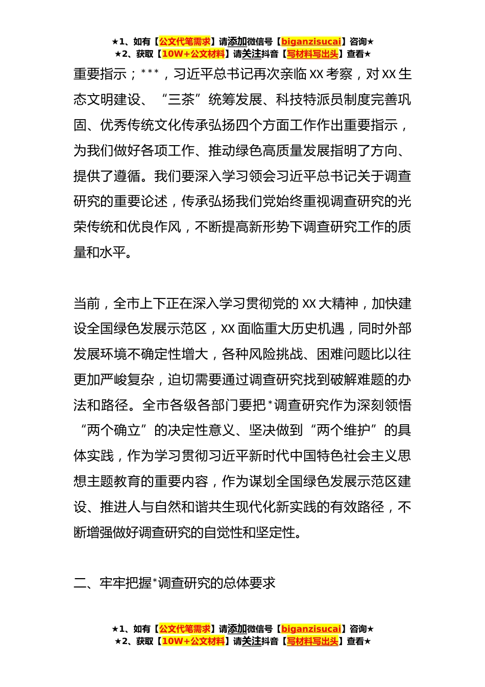 ★1、如有【公文代笔需求】请添加微信号【biganzisucai】咨询★★2、获取【10W+公文材料】请关注抖音【写材料写出头】查看★某市关于在全市*调查研究的实施方案党中央决定,在全党*调查研究,作为在全党开展的学习贯彻习近平新时代中国特色社会主义思想主题教育的重要内容,推动全面建设社会主义现代化国家开好局起好步。为认真贯彻中共中央办公厅印发的《关于在全党*调查研究的工作方案》及中共XX省委办公厅印发的《关于在全省*调查研究的实施方案》精神,加强和改进我市调查研究工作,加快建设全国绿色发展示范区,现制定如下实施方案。一、深刻认识*调查研究的重要意义调查研究是我们党的传家宝,是谋事之基、成事之道。习近平总书记高度重视调查研究工作,反复强调没有调查就没有发言权,没有调查就没有决策权...