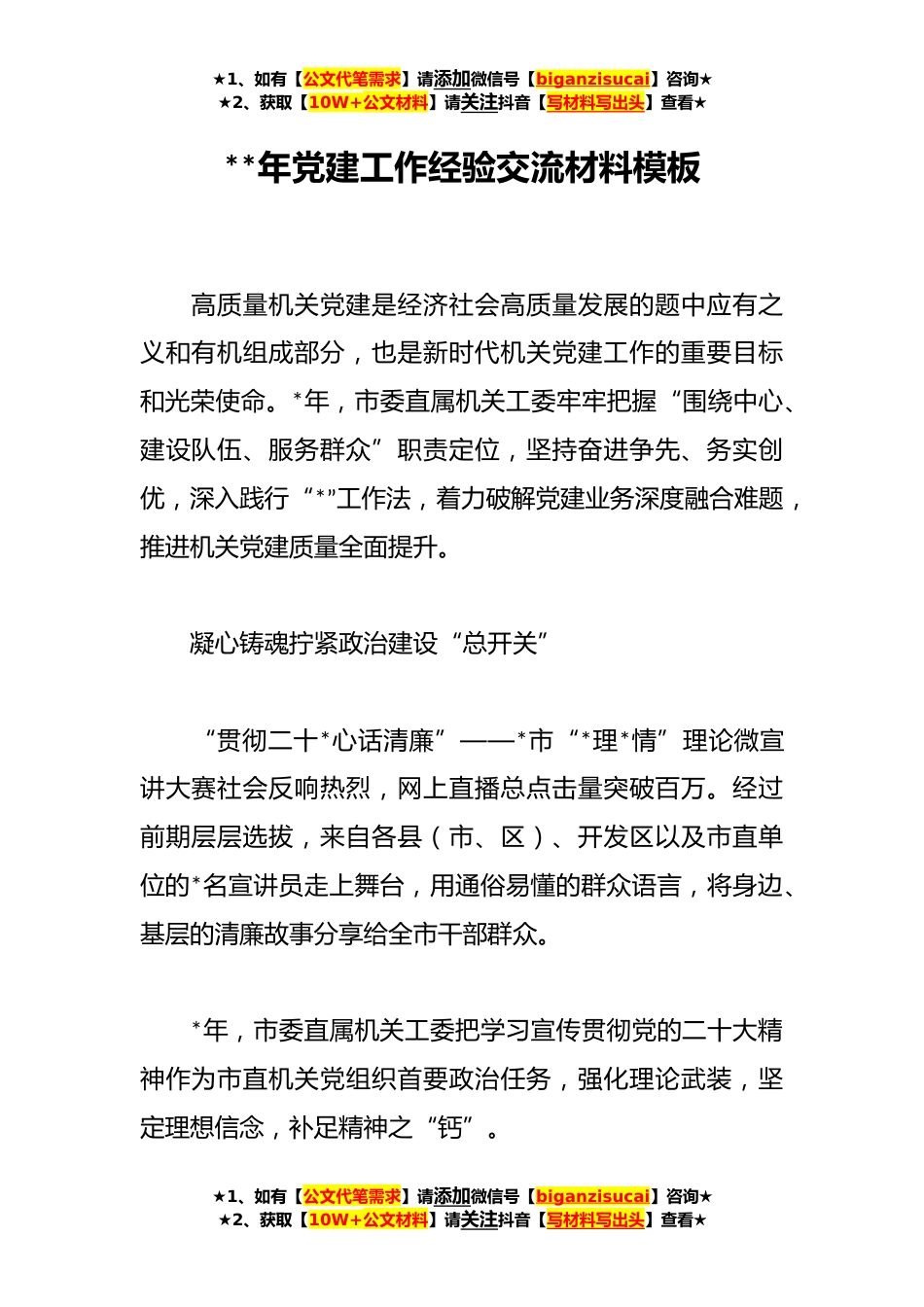 ★1、如有【公文代笔需求】请添加微信号【biganzisucai】咨询★★2、获取【10W+公文材料】请关注抖音【写材料写出头】查看★**年党建工作经验交流材料模板高质量机关党建是经济社会高质量发展的题中应有之义和有机组成部分,也是新时代机关党建工作的重要目标和光荣使命。*年,市委直属机关工委牢牢把握“围绕中心、建设队伍、服务群众”职责定位,坚持奋进争先、务实创优,深入践行“*”工作法,着力破解党建业务深度融合难题,推进机关党建质量全面提升。凝心铸魂拧紧政治建设“总开关”“贯彻二十*心话清廉”——*市“*理*情”理论微宣讲大赛社会反响热烈,网上直播总点击量突破百万。经过前期层层选拔,来自各县(市、区)、开发区以及市直单位的*名宣讲员走上舞台,用通俗易懂的群众语言,将身边、基层的清廉...