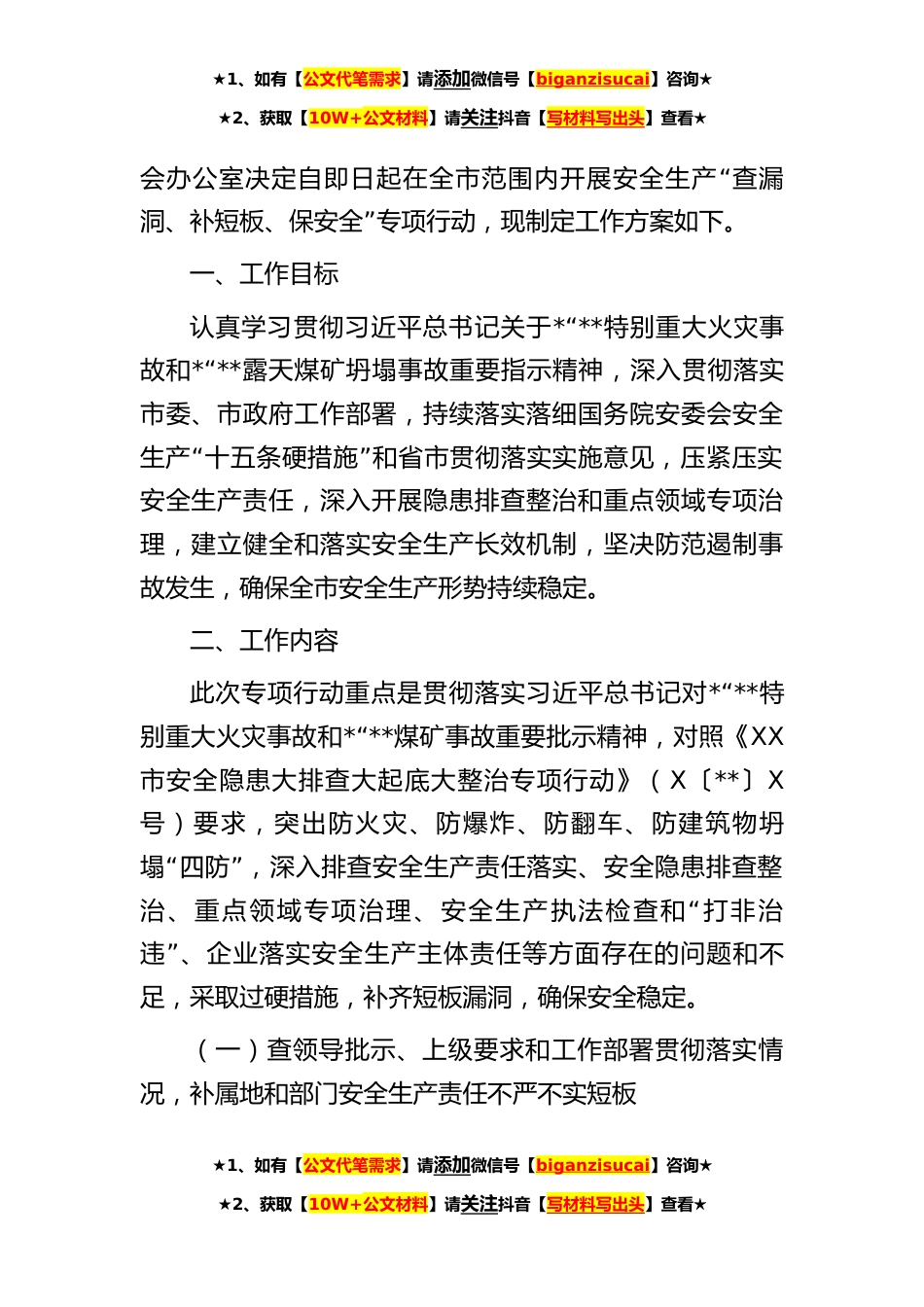 ★1、如有【公文代笔需求】请添加微信号【biganzisucai】咨询★★2、获取【10W+公文材料】请关注抖音【写材料写出头】查看★市安全生产“查漏洞、补短板、保安全”专项行动方案**年*月*,*市文锋区特别重大火灾事故发生后,习近平总书记作出重要指示:*等地接连发生火灾等安全生产事故,造成重大人员伤亡,教训十分深刻!要全力救治受伤人员,妥善做好家属安抚、善后等工作,查明事故原因,依法严肃追究责任。临近年终岁尾,统筹发展和安全各项工作任务较重,各地区和有关部门要始终坚持人民至上、生命至上,压实安全生产责任,全面排查整治各类风险隐患,坚决防范和遏制重特大事故发生。**年**日,**盟*左旗新井煤业有限公司露天煤矿坍塌事故发生后,习近平总书记作出重要指示:**左旗新井煤业有限公司露天煤矿坍...