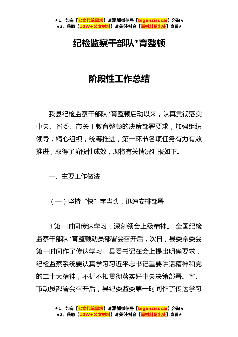 ★1、如有【公文代笔需求】请添加微信号【biganzisucai】咨询★★2、获取【10W+公文材料】请关注抖音【写材料写出头】查看★纪检监察干部队*育整顿阶段性工作总结我县纪检监察干部队*育整顿启动以来,认真贯彻落实中央、省委、市关于教育整顿的决策部署要求,加强组织领导,精心组织,统筹推进,第一环节各项任务有力有效推进,取得了阶段性成效,现将有关情况汇报如下。一、主要工作做法(一)坚持“快”字当头,迅速安排部署1第一时间传达学习,深刻领会上级精神。全国纪检监察干部队*育整顿动员部署会召开后,次日,县委常委会第一时间作了传达学习。县委书记在会上提出明确要求,纪检监察系统要认真学习习近平总书记重要讲话精神和党的二十大精神,不折不扣贯彻落实好中央决策部署。省、市动员部署会召开后,...
