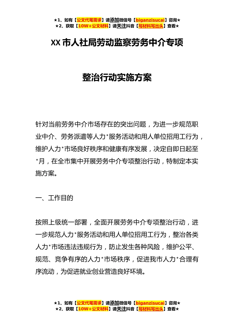 ★1、如有【公文代笔需求】请添加微信号【biganzisucai】咨询★★2、获取【10W+公文材料】请关注抖音【写材料写出头】查看★XX市人社局劳动监察劳务中介专项整治行动实施方案针对当前劳务中介市场存在的突出问题,为进一步规范职业中介、劳务派遣等人力*服务活动和用人单位招用工行为,维护人力*市场良好秩序和健康有序发展,决定自即日起至*月,在全市集中开展劳务中介专项整治行动,特制定本实施方案。一、工作目的按照上级统一部署,全面开展劳务中介专项整治行动,进一步规范人力*服务活动和用人单位招用工行为,整治各类人力*市场违法违规行为,防止发生各种风险,维护公平、规范、竞争有序的人力*市场秩序,促进我市人力*合理有序流动,为促进就业创业营造良好环境。★1、如有【公文代笔需求】请添加微信号...