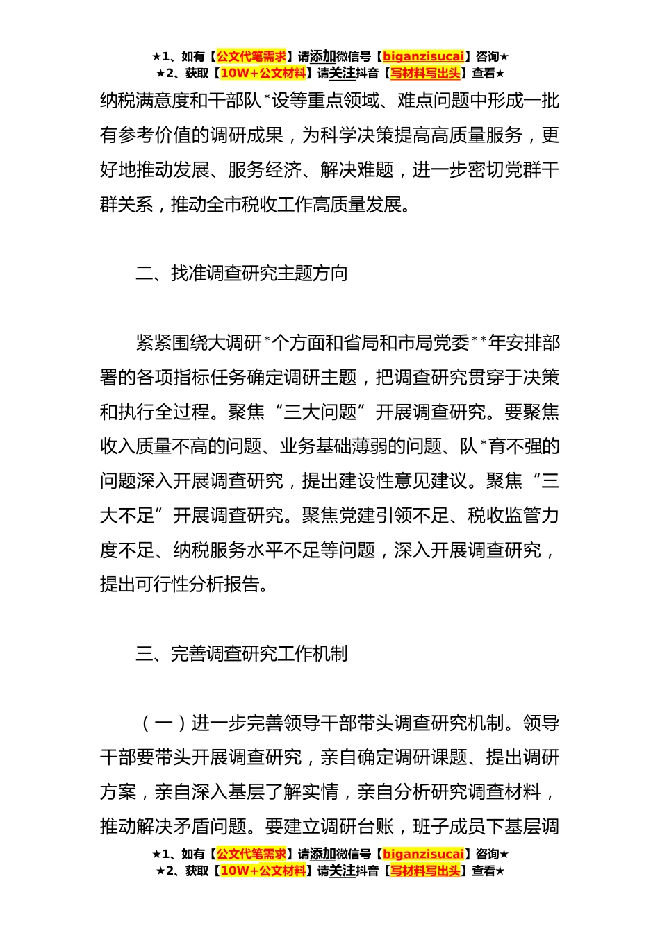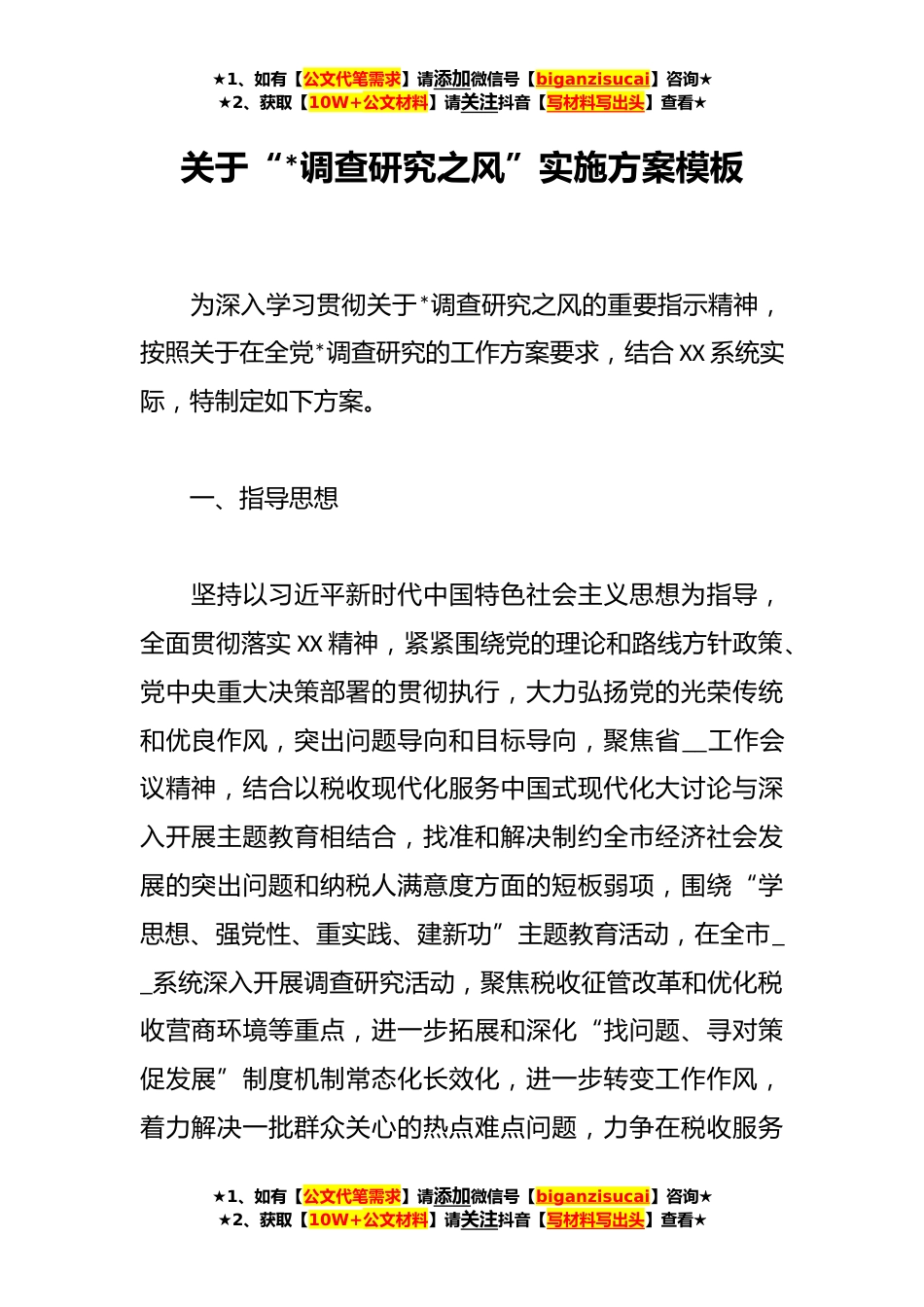 ★1、如有【公文代笔需求】请添加微信号【biganzisucai】咨询★★2、获取【10W+公文材料】请关注抖音【写材料写出头】查看★关于“*调查研究之风”实施方案模板为深入学习贯彻关于*调查研究之风的重要指示精神,按照关于在全党*调查研究的工作方案要求,结合XX系统实际,特制定如下方案。一、指导思想坚持以习近平新时代中国特色社会主义思想为指导,全面贯彻落实XX精神,紧紧围绕党的理论和路线方针政策、党中央重大决策部署的贯彻执行,大力弘扬党的光荣传统和优良作风,突出问题导向和目标导向,聚焦省__工作会议精神,结合以税收现代化服务中国式现代化大讨论与深入开展主题教育相结合,找准和解决制约全市经济社会发展的突出问题和纳税人满意度方面的短板弱项,围绕“学思想、强党性、重实践、建新功”主题教...