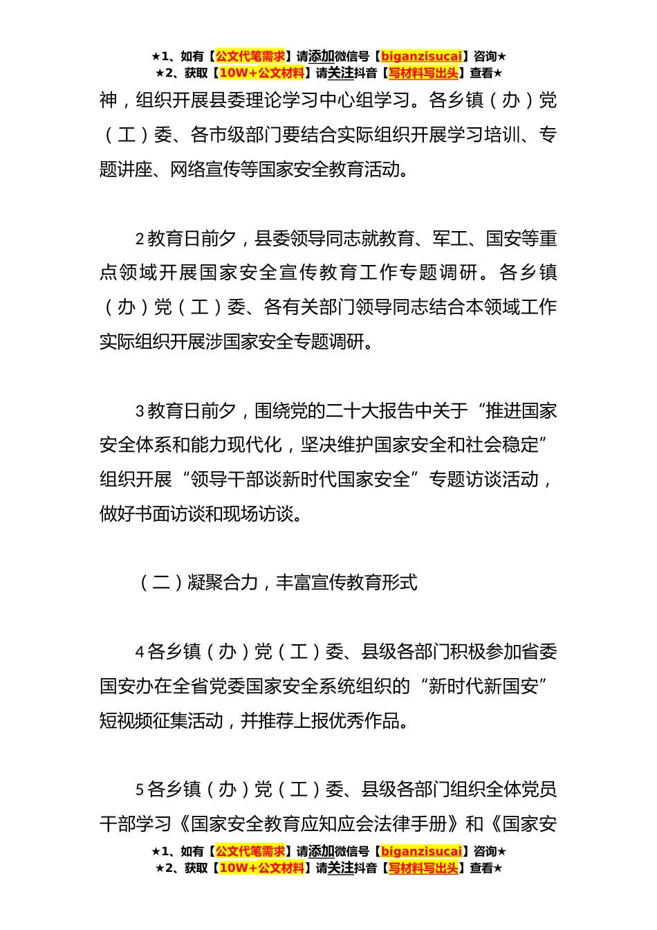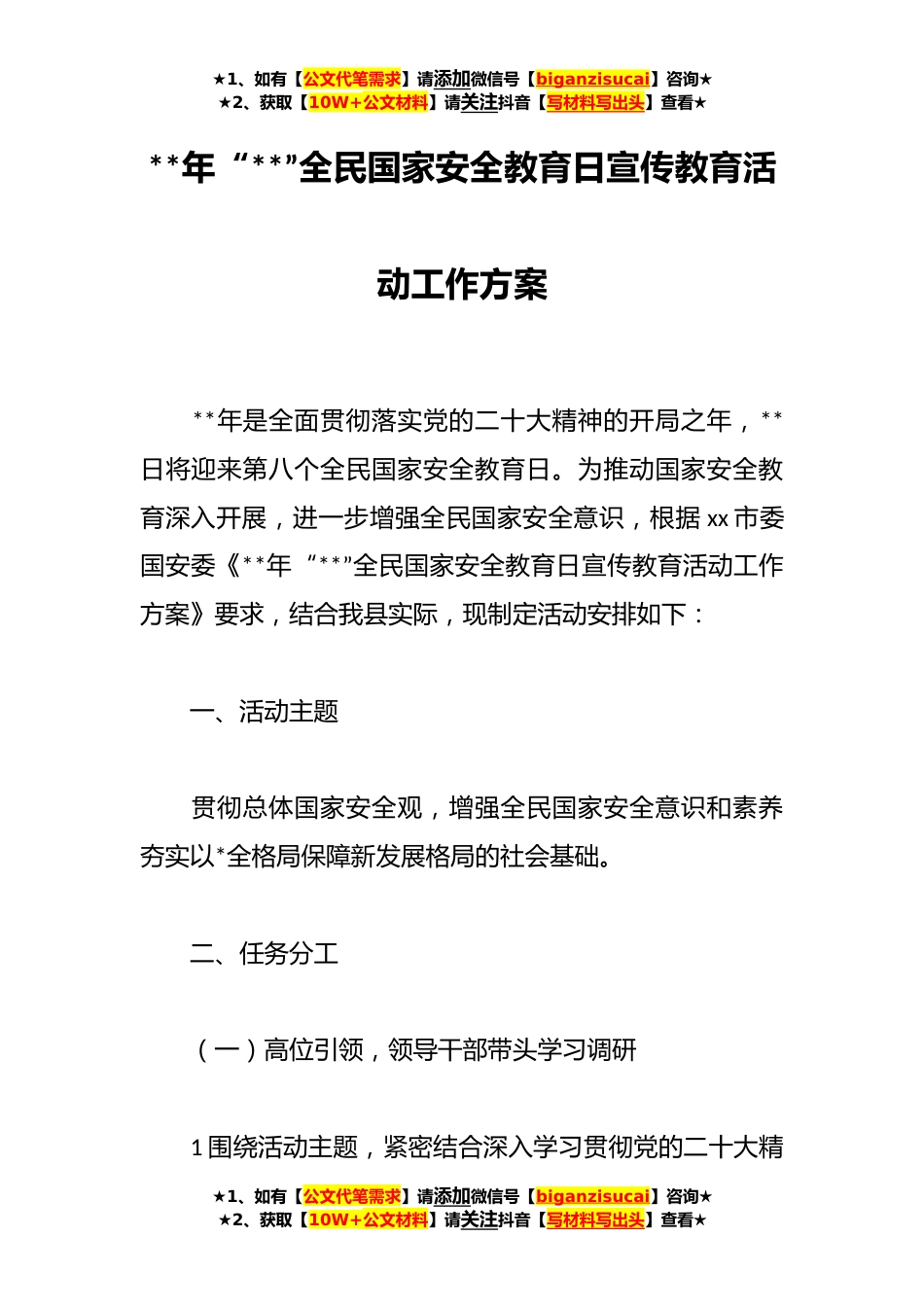 ★1、如有【公文代笔需求】请添加微信号【biganzisucai】咨询★★2、获取【10W+公文材料】请关注抖音【写材料写出头】查看★**年“**”全民国家安全教育日宣传教育活动工作方案**年是全面贯彻落实党的二十大精神的开局之年,**日将迎来第八个全民国家安全教育日。为推动国家安全教育深入开展,进一步增强全民国家安全意识,根据xx市委国安委《**年“**”全民国家安全教育日宣传教育活动工作方案》要求,结合我县实际,现制定活动安排如下:一、活动主题贯彻总体国家安全观,增强全民国家安全意识和素养夯实以*全格局保障新发展格局的社会基础。二、任务分工(一)高位引领,领导干部带头学习调研1围绕活动主题,紧密结合深入学习贯彻党的二十大精★1、如有【公文代笔需求】请添加微信号【biganzisucai】咨询★★2...