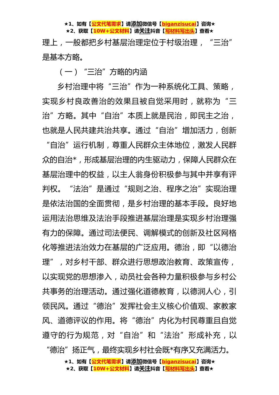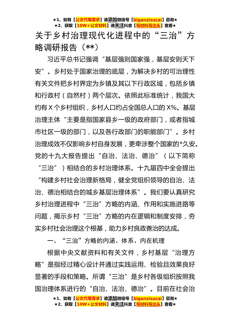 ★1、如有【公文代笔需求】请添加微信号【biganzisucai】咨询★★2、获取【10W+公文材料】请关注抖音【写材料写出头】查看★关于乡村治理现代化进程中的“三治”方略调研报告(**)习近平总书记强调“基层强则国家强,基层安则天下安”。乡村处于国家治理的底层,为解决乡村的可治理性有关文件把乡村界定为乡镇及其以下行政区域,包括乡镇和行政村(自然村)两个层次。依照此标准统计,我国大约有X个乡村组织,乡村人口约占全国总人口的X%。基层治理主体“主要是指国家县乡一级的政府部门,或者指城市社区一级的部门,以及各行政部门的职能部门”。乡村治理成效不仅影响乡村自身发展,更牵涉整个国家的*久安。党的十九大报告提出“自治、法治、德治”(以下简称“三治”)相结合的乡村治理体系。十九届四中全会提...