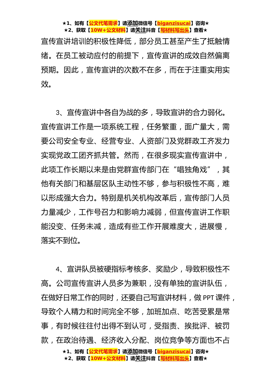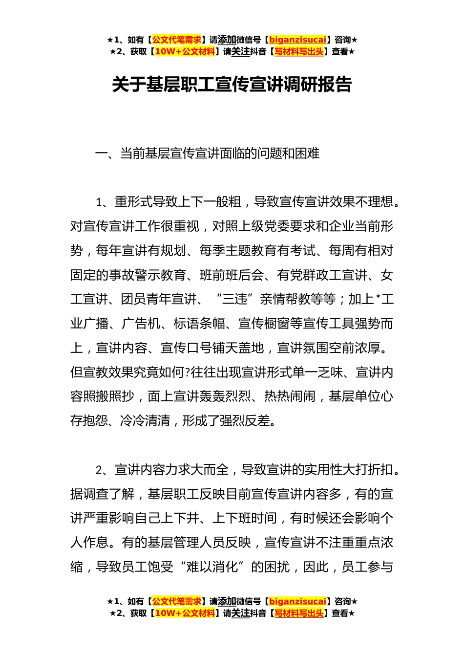 ★1、如有【公文代笔需求】请添加微信号【biganzisucai】咨询★★2、获取【10W+公文材料】请关注抖音【写材料写出头】查看★关于基层职工宣传宣讲调研报告一、当前基层宣传宣讲面临的问题和困难1、重形式导致上下一般粗,导致宣传宣讲效果不理想。对宣传宣讲工作很重视,对照上级党委要求和企业当前形势,每年宣讲有规划、每季主题教育有考试、每周有相对固定的事故警示教育、班前班后会、有党群政工宣讲、女工宣讲、团员青年宣讲、“三违”亲情帮教等等;加上*工业广播、广告机、标语条幅、宣传橱窗等宣传工具强势而上,宣讲内容、宣传口号铺天盖地,宣讲氛围空前浓厚。但宣教效果究竟如何?往往出现宣讲形式单一乏味、宣讲内容照搬照抄,面上宣讲轰轰烈烈、热热闹闹,基层单位心存抱怨、冷冷清清,形成了强烈反差...