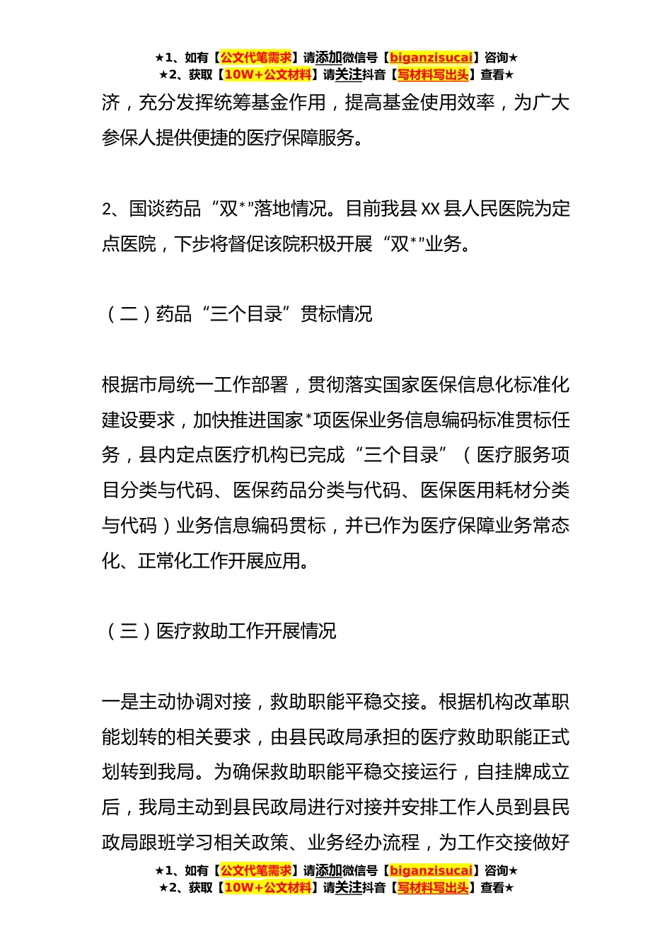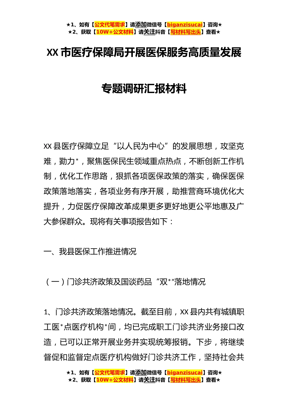 ★1、如有【公文代笔需求】请添加微信号【biganzisucai】咨询★★2、获取【10W+公文材料】请关注抖音【写材料写出头】查看★XX市医疗保障局开展医保服务高质量发展专题调研汇报材料XX县医疗保障立足“以人民为中心”的发展思想,攻坚克难,勠力*,聚焦医保民生领域重点热点,不断创新工作机制,优化工作思路,狠抓各项医保政策的落实,确保医保政策落地落实,各项业务有序开展,助推营商环境优化大提升,力促医疗保障改革成果更多更好地更公平地惠及广大参保群众。现将有关事项报告如下:一、我县医保工作推进情况(一)门诊共济政策及国谈药品“双*”落地情况1、门诊共济政策落地情况。截至目前,XX县内共有城镇职工医*点医疗机构*间,均已完成职工门诊共济业务接口改造,已可以正常开展业务并实现统筹报销。下步...