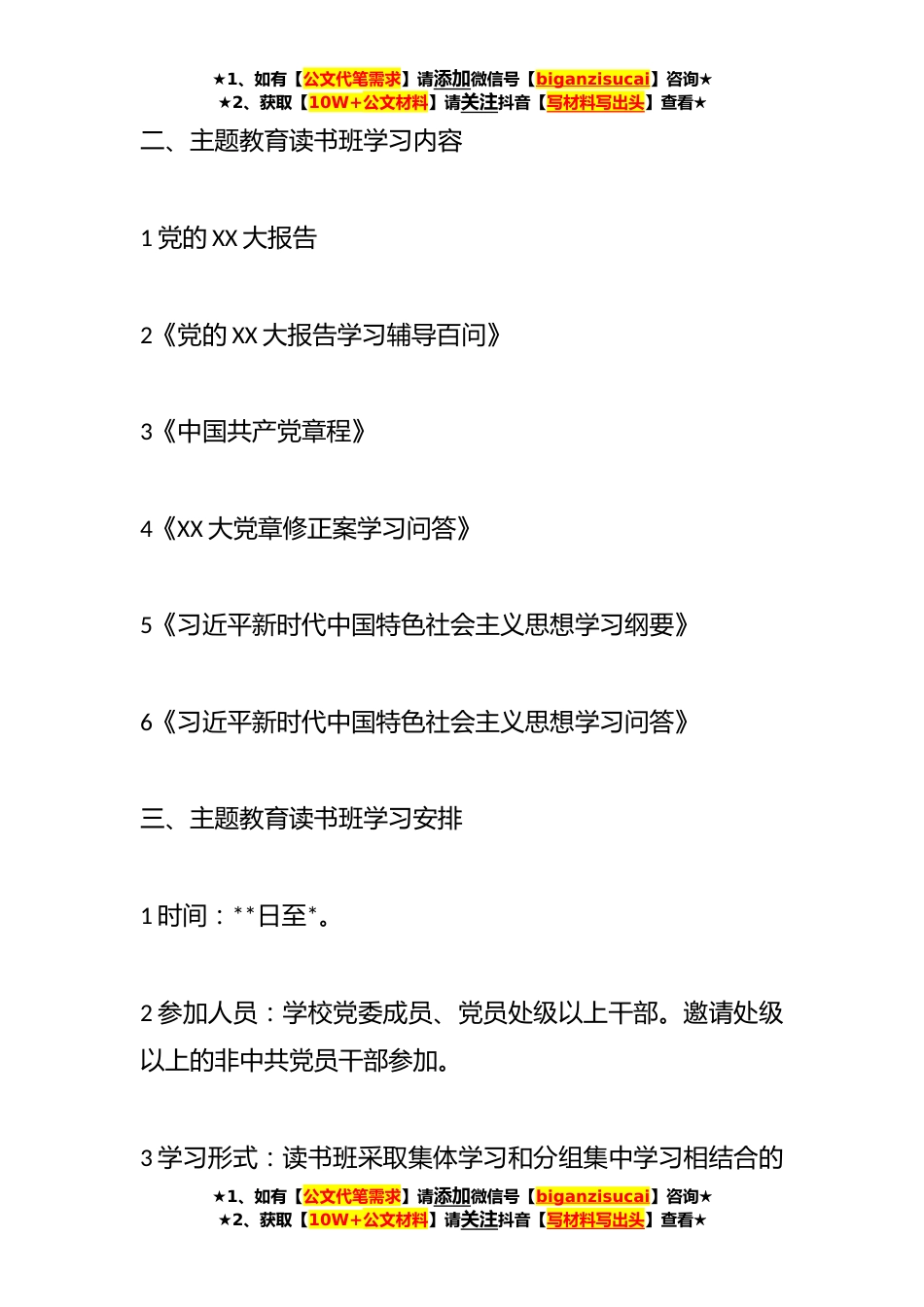 ★1、如有【公文代笔需求】请添加微信号【biganzisucai】咨询★★2、获取【10W+公文材料】请关注抖音【写材料写出头】查看★某高校学习贯彻**年主题教育读书班实施方案根据《中共XX学院委员会关于在全校深入开展学习贯彻习近平新时代中国特色社会主义思想主题教育的工作方案》要求,现就举办我校主题教育读书班制订如下方案。一、主题教育读书班指导思想坚持以习近平新时代中国特色社会主义思想和党的XX大精神为指导,持续推动广大领导干部全面、系统、深入学习习近平新时代中国特色社会主义思想,切实增强忠诚核心拥戴核心、维护核心、捍卫核心的政治自觉、思想自觉、行动自觉,切实把习近平新时代中国特色社会主义思想转化为坚定理想、锤炼党性和指导实践、推动工作的强大力量。★1、如有【公文代笔需求】请添加...
