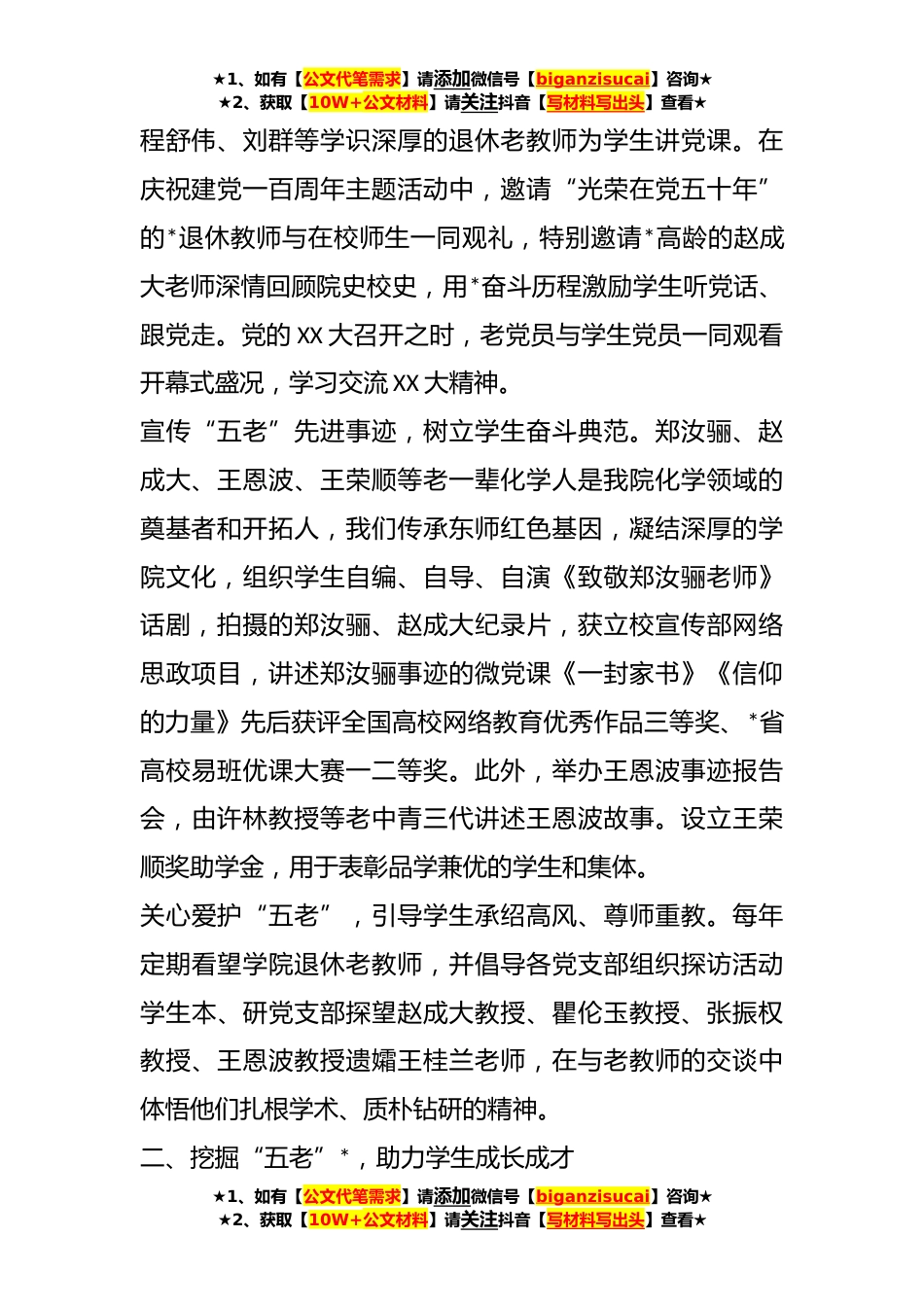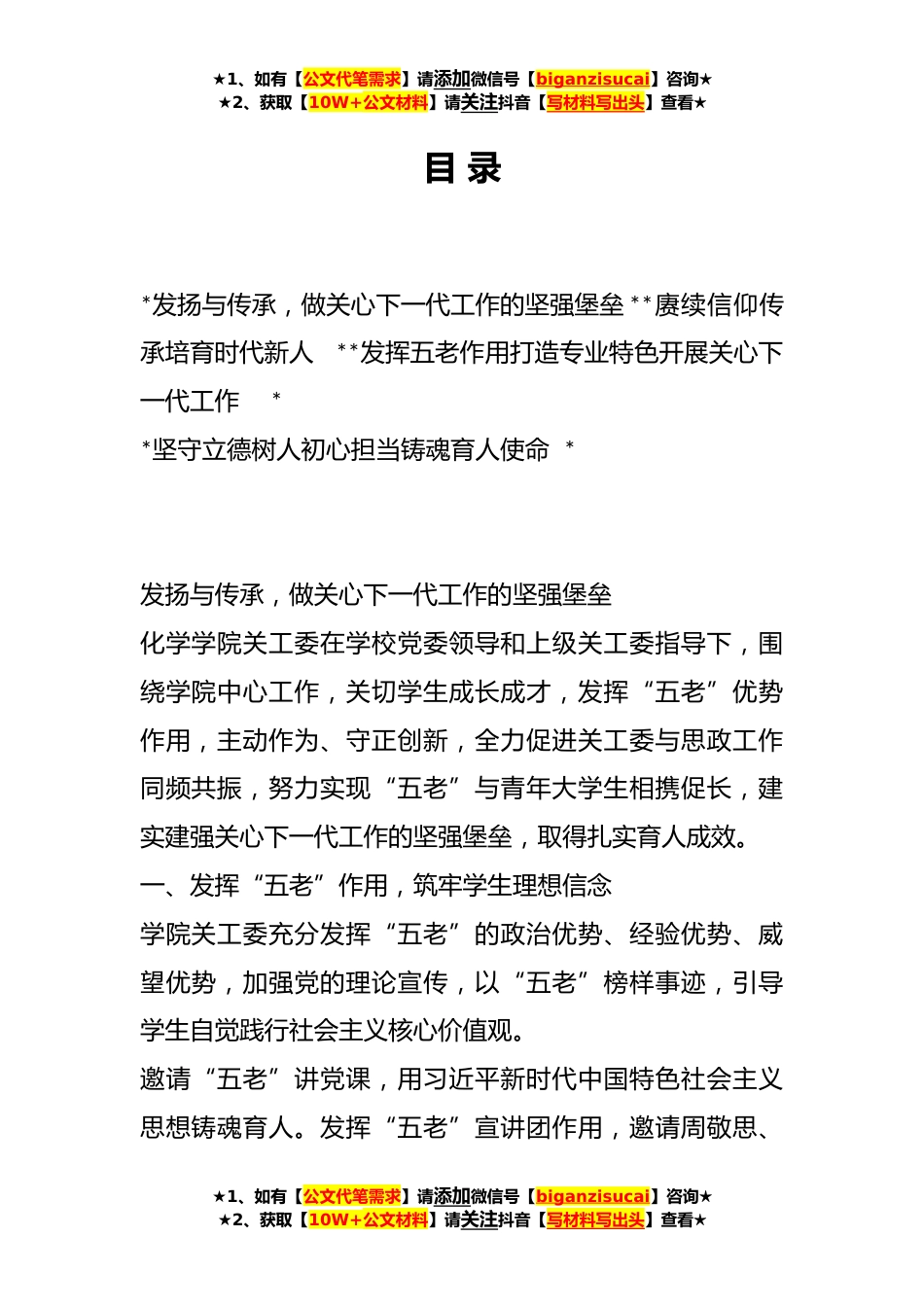 ★1、如有【公文代笔需求】请添加微信号【biganzisucai】咨询★★2、获取【10W+公文材料】请关注抖音【写材料写出头】查看★目录*发扬与传承,做关心下一代工作的坚强堡垒**赓续信仰传承培育时代新人**发挥五老作用打造专业特色开展关心下一代工作**坚守立德树人初心担当铸魂育人使命*发扬与传承,做关心下一代工作的坚强堡垒化学学院关工委在学校党委领导和上级关工委指导下,围绕学院中心工作,关切学生成长成才,发挥“五老”优势作用,主动作为、守正创新,全力促进关工委与思政工作同频共振,努力实现“五老”与青年大学生相携促长,建实建强关心下一代工作的坚强堡垒,取得扎实育人成效。一、发挥“五老”作用,筑牢学生理想信念学院关工委充分发挥“五老”的政治优势、经验优势、威望优势,加强党的理论宣...