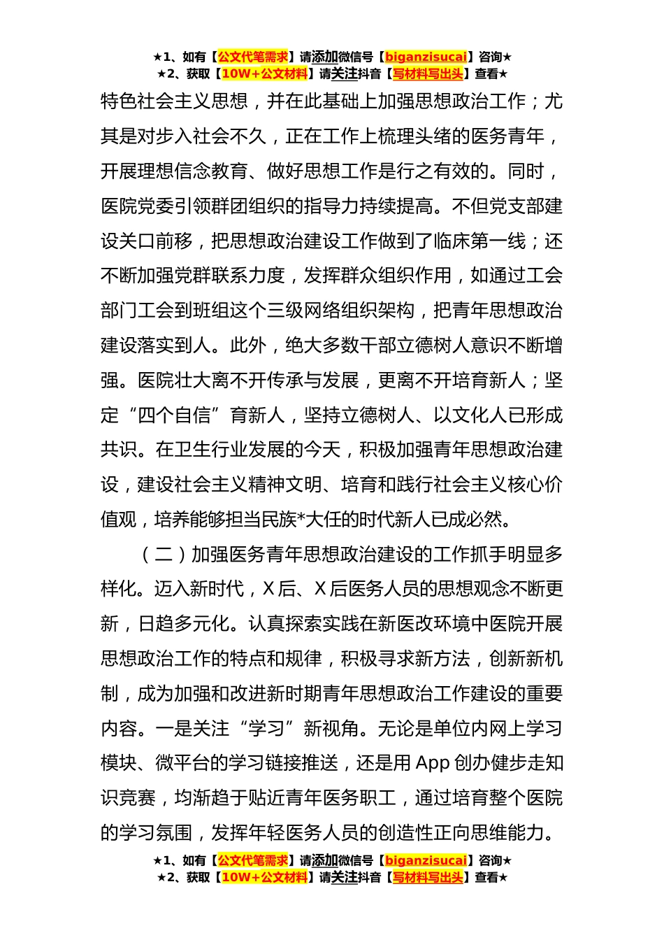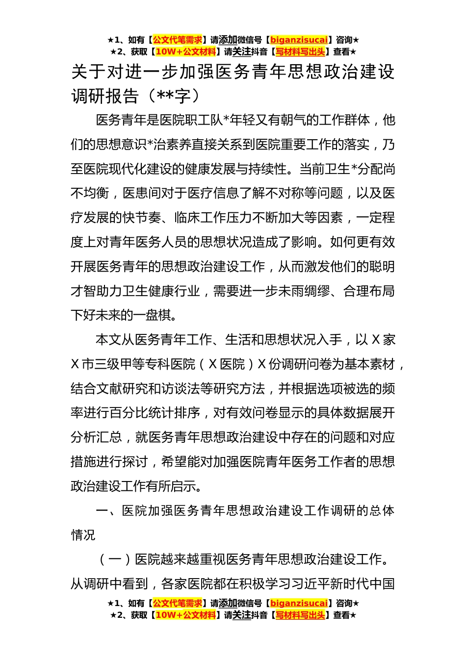 ★1、如有【公文代笔需求】请添加微信号【biganzisucai】咨询★★2、获取【10W+公文材料】请关注抖音【写材料写出头】查看★关于对进一步加强医务青年思想政治建设调研报告(**字)医务青年是医院职工队*年轻又有朝气的工作群体,他们的思想意识*治素养直接关系到医院重要工作的落实,乃至医院现代化建设的健康发展与持续性。当前卫生*分配尚不均衡,医患间对于医疗信息了解不对称等问题,以及医疗发展的快节奏、临床工作压力不断加大等因素,一定程度上对青年医务人员的思想状况造成了影响。如何更有效开展医务青年的思想政治建设工作,从而激发他们的聪明才智助力卫生健康行业,需要进一步未雨绸缪、合理布局下好未来的一盘棋。本文从医务青年工作、生活和思想状况入手,以X家X市三级甲等专科医院(X医院)X份调...