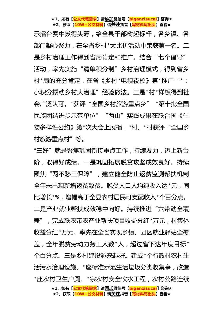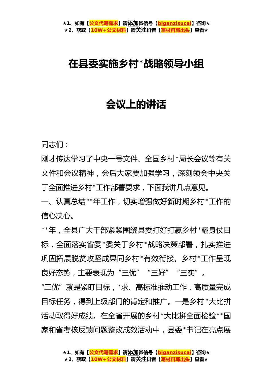 ★1、如有【公文代笔需求】请添加微信号【biganzisucai】咨询★★2、获取【10W+公文材料】请关注抖音【写材料写出头】查看★在县委实施乡村*战略领导小组会议上的讲话同志们:刚才传达学习了中央一号文件、全国乡村*局长会议等有关文件和会议精神,会后大家要加强学习,深刻领会中央关于全面推进乡村*工作部署要求,下面我讲几点意见。一、认真总结**年工作,切实增强做好新时期乡村*工作的信心决心。**年,全县广大干部紧紧围绕县委打好打赢乡村*翻身仗目标,全面落实省委*委关于乡村*战略决策部署,扎实推进巩固拓展脱贫攻坚成果同乡村*有效衔接。乡村*工作呈现良好态势,主要表现为“三优”“三好”“三实”。“三优”就是紧盯目标,*求、高标准推动工作,高质量完成目标任务,得到上级部门的肯定和推广。一是...