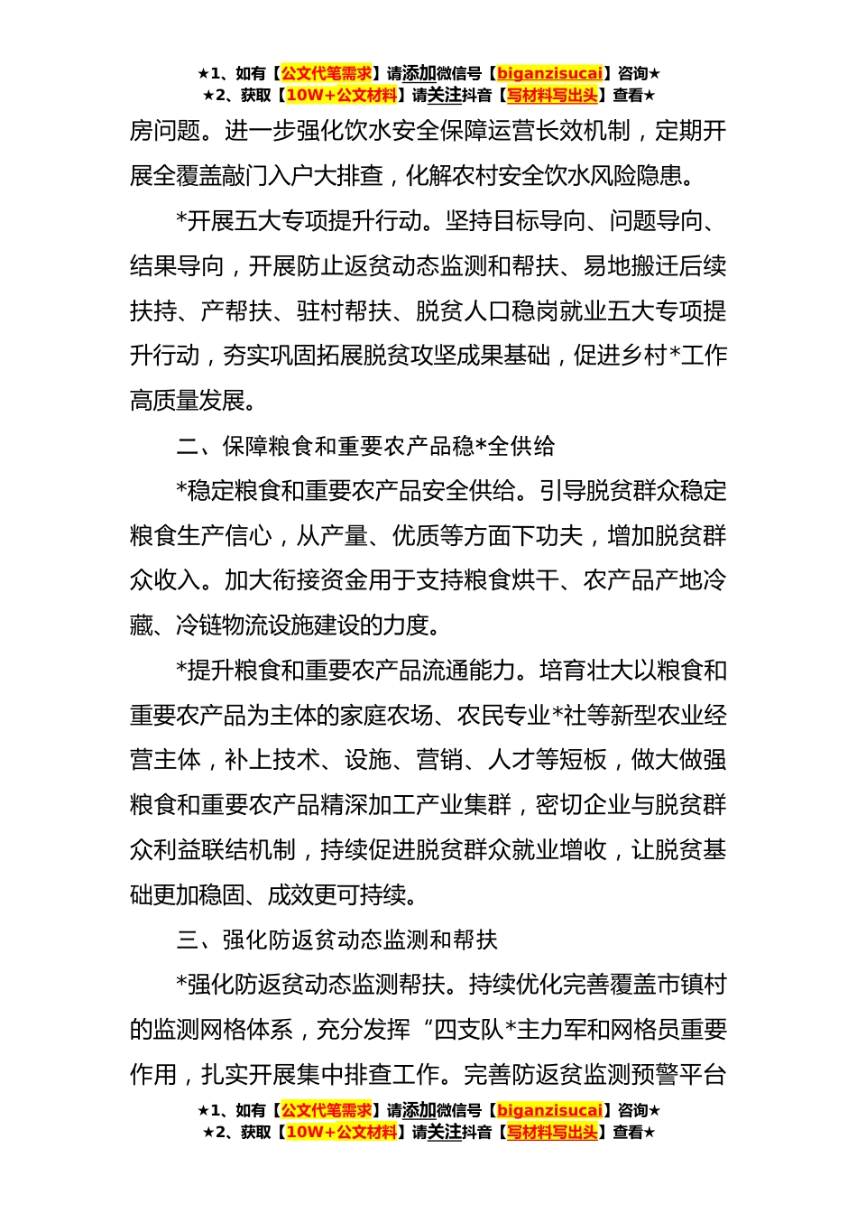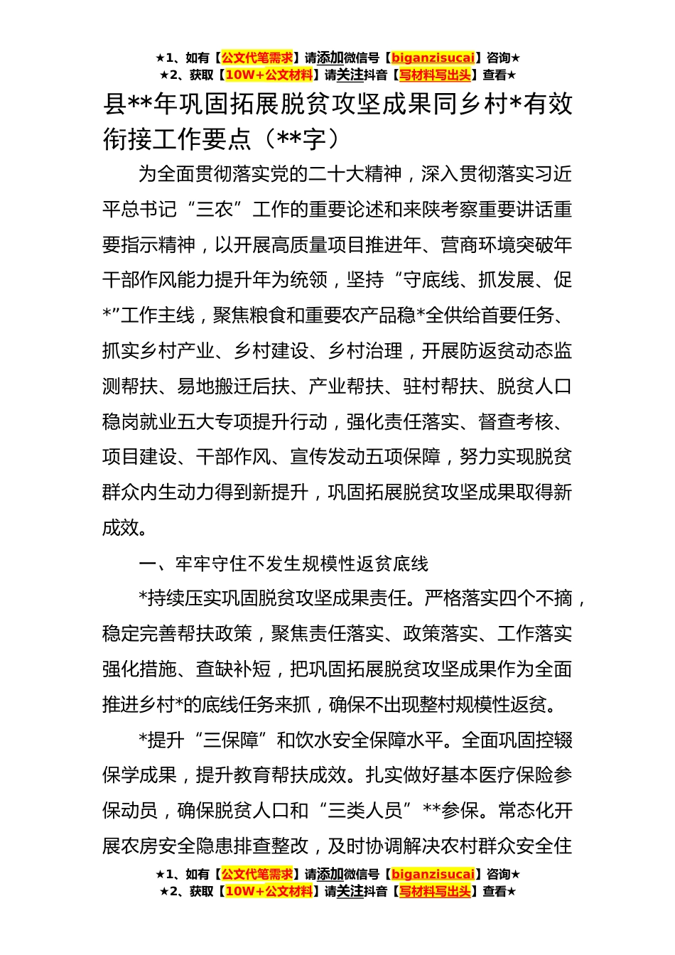 ★1、如有【公文代笔需求】请添加微信号【biganzisucai】咨询★★2、获取【10W+公文材料】请关注抖音【写材料写出头】查看★县**年巩固拓展脱贫攻坚成果同乡村*有效衔接工作要点(**字)为全面贯彻落实党的二十大精神,深入贯彻落实习近平总书记“三农”工作的重要论述和来陕考察重要讲话重要指示精神,以开展高质量项目推进年、营商环境突破年干部作风能力提升年为统领,坚持“守底线、抓发展、促*”工作主线,聚焦粮食和重要农产品稳*全供给首要任务、抓实乡村产业、乡村建设、乡村治理,开展防返贫动态监测帮扶、易地搬迁后扶、产业帮扶、驻村帮扶、脱贫人口稳岗就业五大专项提升行动,强化责任落实、督查考核、项目建设、干部作风、宣传发动五项保障,努力实现脱贫群众内生动力得到新提升,巩固拓展脱贫攻坚成...