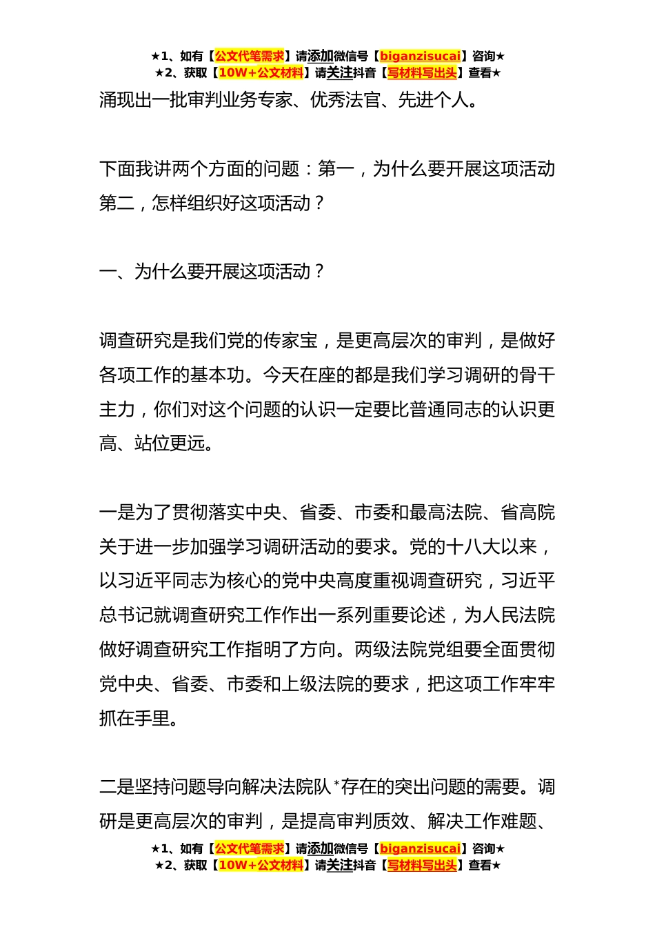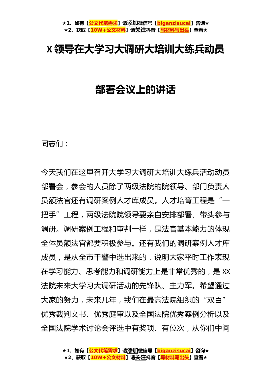★1、如有【公文代笔需求】请添加微信号【biganzisucai】咨询★★2、获取【10W+公文材料】请关注抖音【写材料写出头】查看★X领导在大学习大调研大培训大练兵动员部署会议上的讲话同志们:今天我们在这里召开大学习大调研大培训大练兵活动动员部署会,参会的人员除了两级法院的院领导、部门负责人员额法官还有调研案例人才库成员。人才培育工程是“一把手”工程,两级法院院领导要亲自安排部署、带头参与调研。调研案例工程和审判一样,是法官基本能力的体现全体员额法官都要积极参与。还有我们的调研案例人才库成员,是从全市干警中选出来的,说明大家平时工作表现在学习能力、思考能力和调研能力上是非常优秀的,是XX法院未来大学习大调研活动的先锋队、主力军。希望通过大家的努力,未来几年,我们在最高法院组...