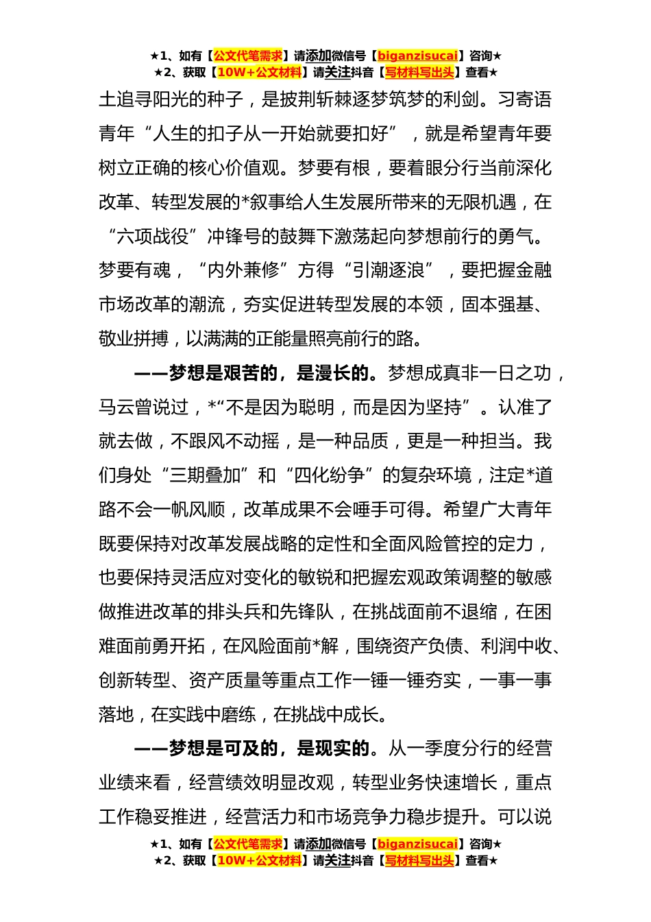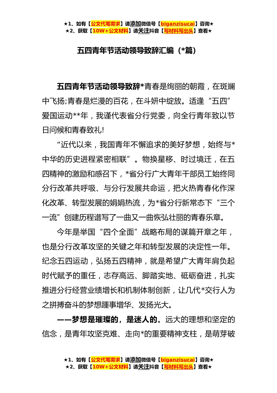 ★1、如有【公文代笔需求】请添加微信号【biganzisucai】咨询★★2、获取【10W+公文材料】请关注抖音【写材料写出头】查看★五四青年节活动领导致辞汇编(*篇)五四青年节活动领导致辞*青春是绚丽的朝霞,在斑斓中飞扬;青春是烂漫的百花,在斗妍中绽放。适逢“五四”爱国运动**年,我谨代表省分行党委,向全行青年致以节日问候和青春致礼!“近代以来,我国青年不懈追求的美好梦想,始终与*中华的历史进程紧密相联”。物换星移、时过境迁,在五四精神的激励和感召下,*省分行广大青年干部员工始终同分行改革共呼吸、与分行发展共命运,把火热青春化作深化改革、转型发展的娟娟热流,为*省分行新常态下“三个一流”创建历程谱写了一曲又一曲恢弘壮丽的青春乐章。今年是举国“四个全面”战略布局的谋篇开章之年,也是...