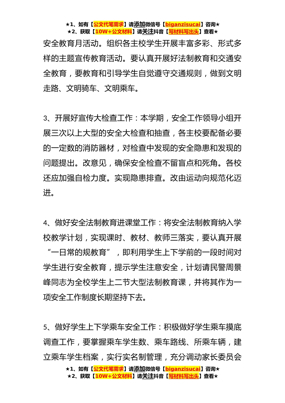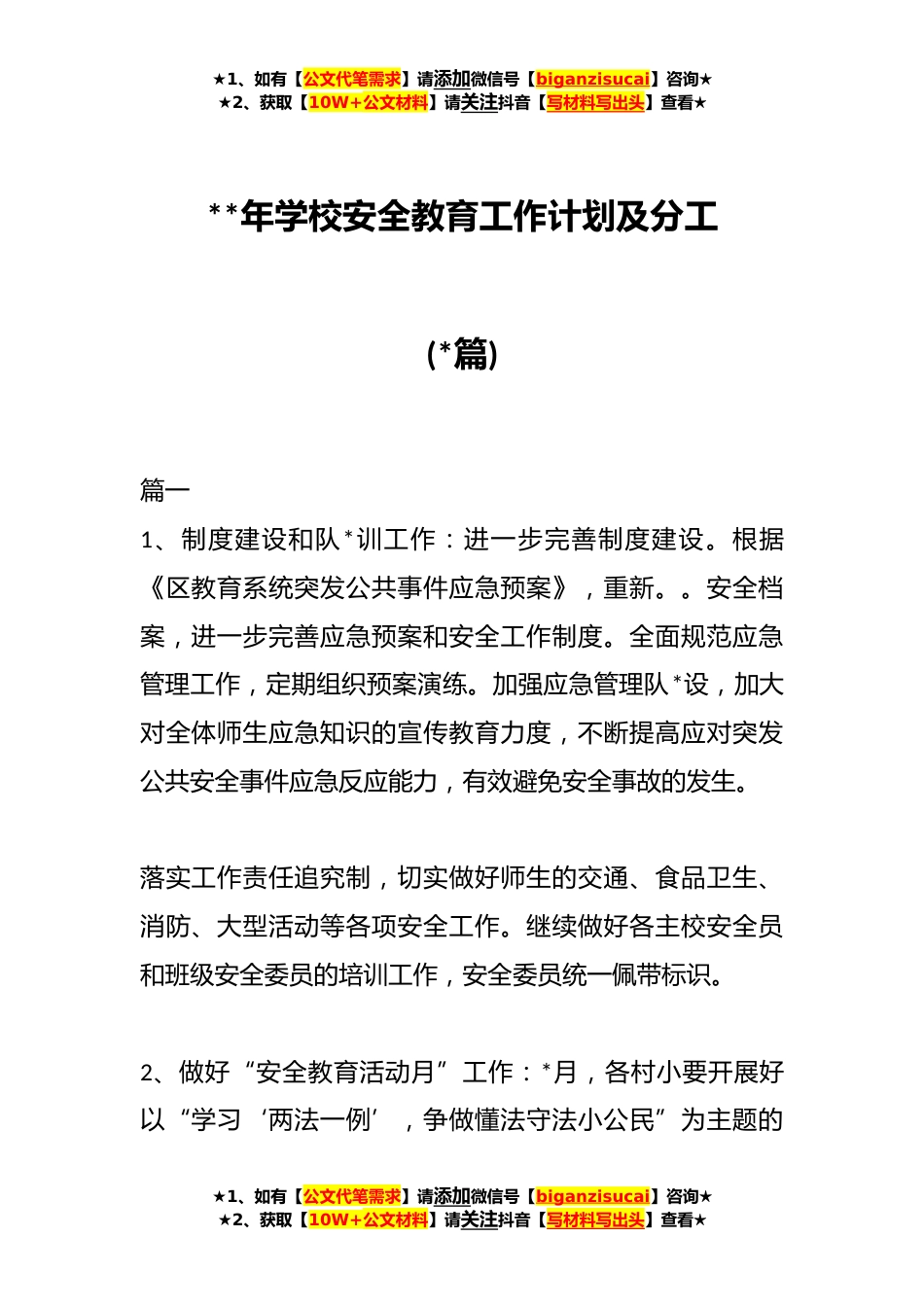 ★1、如有【公文代笔需求】请添加微信号【biganzisucai】咨询★★2、获取【10W+公文材料】请关注抖音【写材料写出头】查看★**年学校安全教育工作计划及分工(*篇)篇一1、制度建设和队*训工作:进一步完善制度建设。根据《区教育系统突发公共事件应急预案》,重新。。安全档案,进一步完善应急预案和安全工作制度。全面规范应急管理工作,定期组织预案演练。加强应急管理队*设,加大对全体师生应急知识的宣传教育力度,不断提高应对突发公共安全事件应急反应能力,有效避免安全事故的发生。落实工作责任追究制,切实做好师生的交通、食品卫生、消防、大型活动等各项安全工作。继续做好各主校安全员和班级安全委员的培训工作,安全委员统一佩带标识。2、做好“安全教育活动月”工作:*月,各村小要开展好以“学习‘...