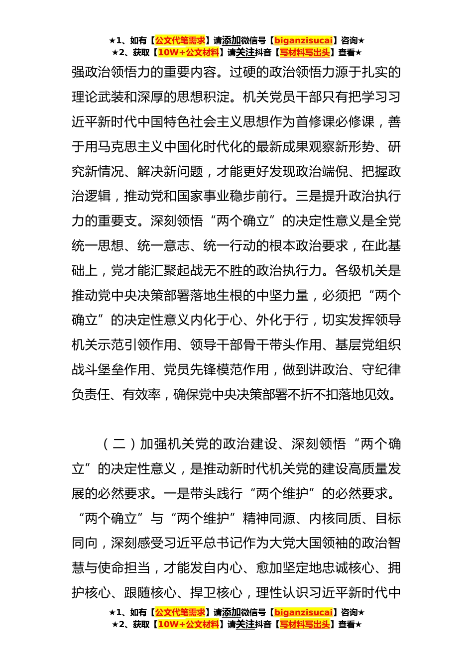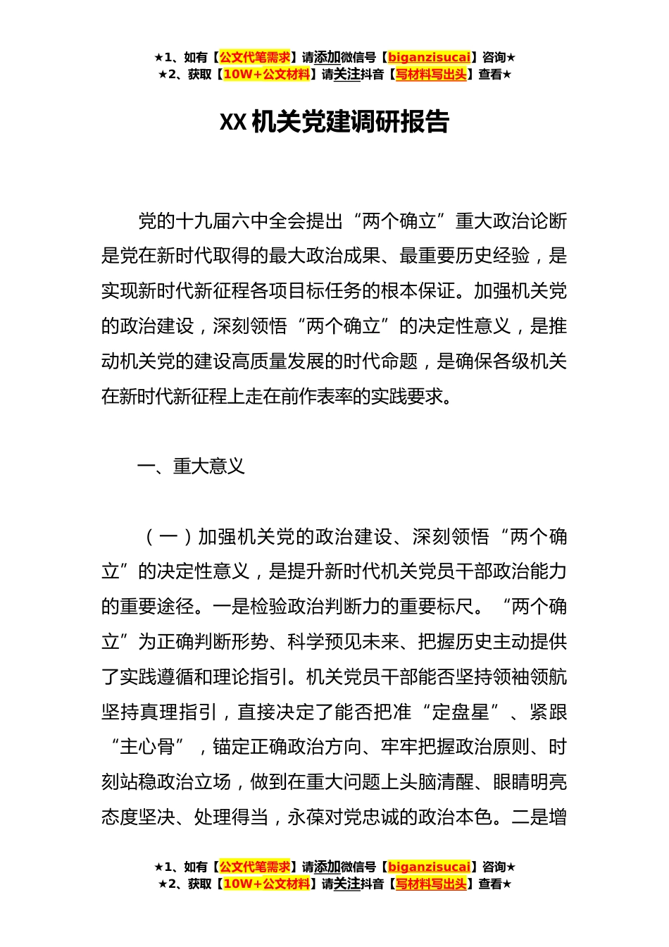 ★1、如有【公文代笔需求】请添加微信号【biganzisucai】咨询★★2、获取【10W+公文材料】请关注抖音【写材料写出头】查看★XX机关党建调研报告党的十九届六中全会提出“两个确立”重大政治论断是党在新时代取得的最大政治成果、最重要历史经验,是实现新时代新征程各项目标任务的根本保证。加强机关党的政治建设,深刻领悟“两个确立”的决定性意义,是推动机关党的建设高质量发展的时代命题,是确保各级机关在新时代新征程上走在前作表率的实践要求。一、重大意义(一)加强机关党的政治建设、深刻领悟“两个确立”的决定性意义,是提升新时代机关党员干部政治能力的重要途径。一是检验政治判断力的重要标尺。“两个确立”为正确判断形势、科学预见未来、把握历史主动提供了实践遵循和理论指引。机关党员干部能...
