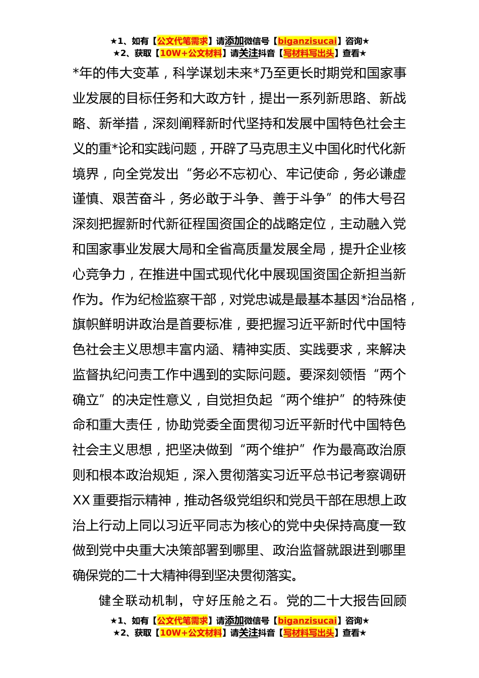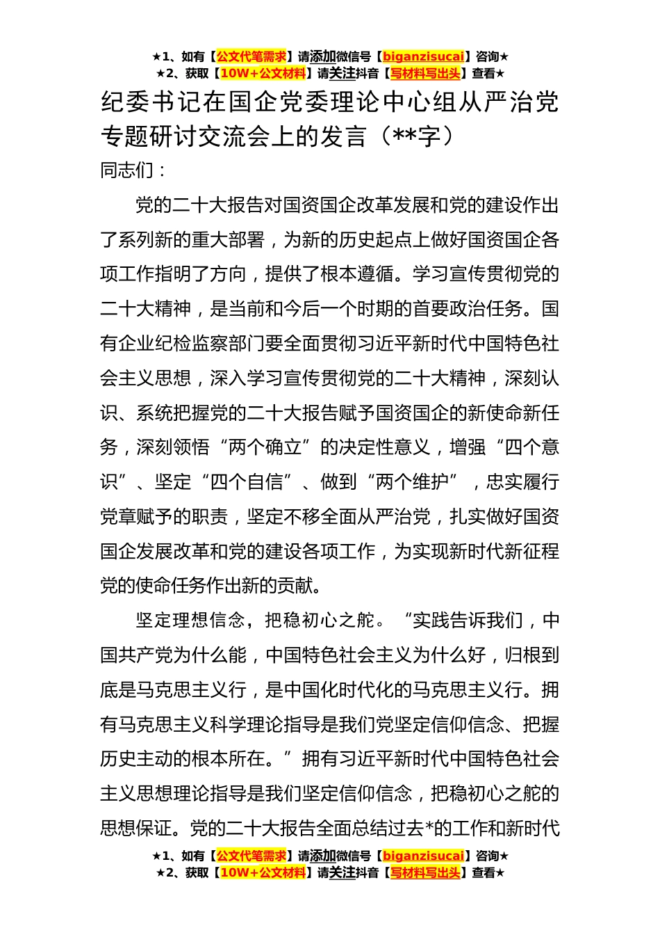 ★1、如有【公文代笔需求】请添加微信号【biganzisucai】咨询★★2、获取【10W+公文材料】请关注抖音【写材料写出头】查看★纪委书记在国企党委理论中心组从严治党专题研讨交流会上的发言(**字)同志们:党的二十大报告对国资国企改革发展和党的建设作出了系列新的重大部署,为新的历史起点上做好国资国企各项工作指明了方向,提供了根本遵循。学习宣传贯彻党的二十大精神,是当前和今后一个时期的首要政治任务。国有企业纪检监察部门要全面贯彻习近平新时代中国特色社会主义思想,深入学习宣传贯彻党的二十大精神,深刻认识、系统把握党的二十大报告赋予国资国企的新使命新任务,深刻领悟“两个确立”的决定性意义,增强“四个意识”、坚定“四个自信”、做到“两个维护”,忠实履行党章赋予的职责,坚定不移全...