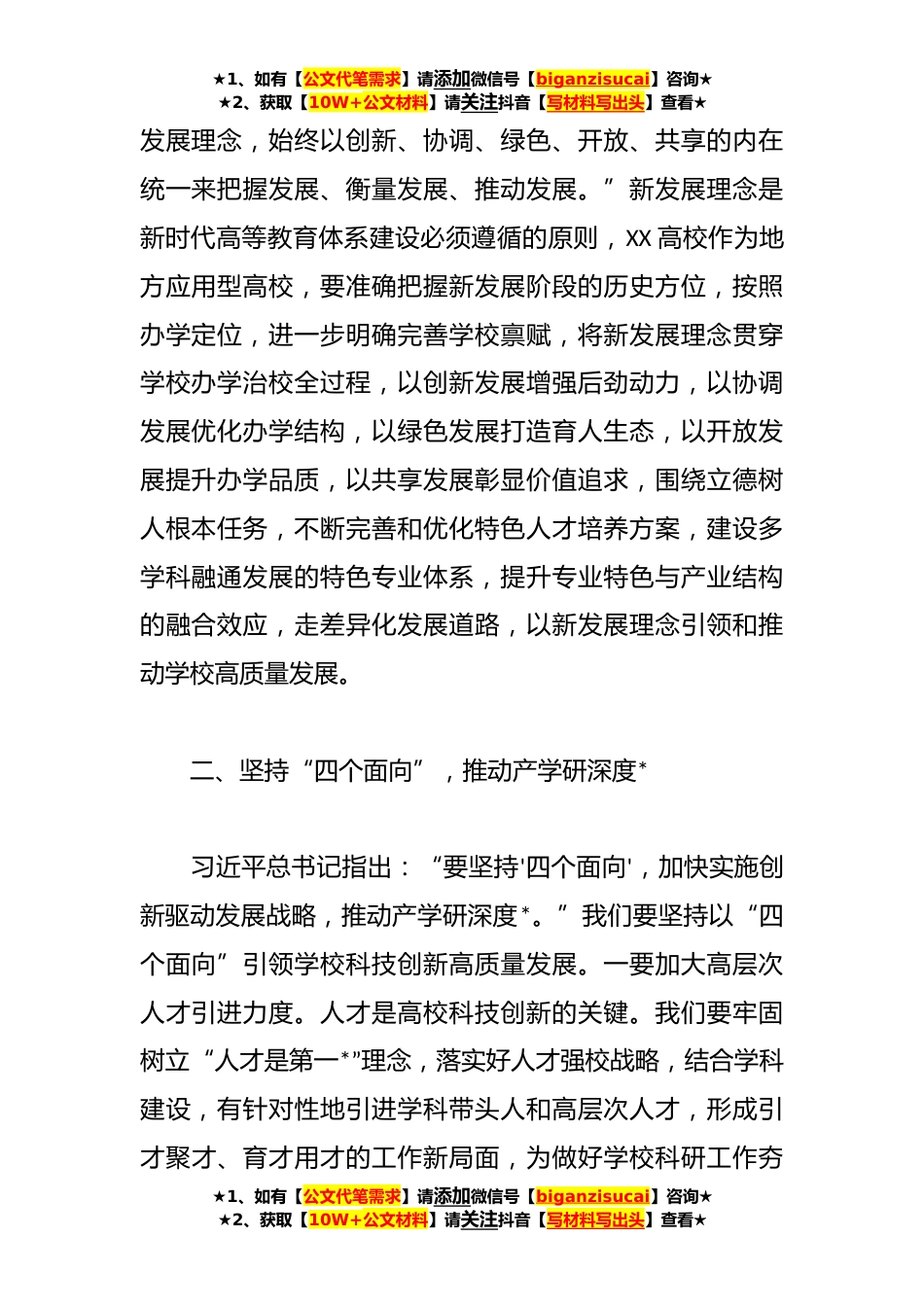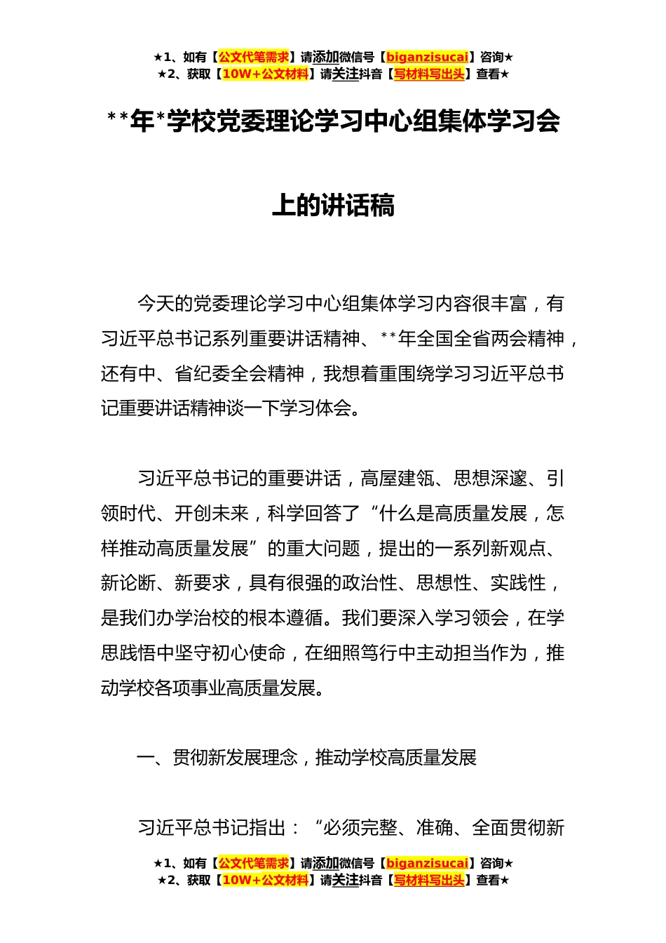 ★1、如有【公文代笔需求】请添加微信号【biganzisucai】咨询★★2、获取【10W+公文材料】请关注抖音【写材料写出头】查看★**年*学校党委理论学习中心组集体学习会上的讲话稿今天的党委理论学习中心组集体学习内容很丰富,有习近平总书记系列重要讲话精神、**年全国全省两会精神,还有中、省纪委全会精神,我想着重围绕学习习近平总书记重要讲话精神谈一下学习体会。习近平总书记的重要讲话,高屋建瓴、思想深邃、引领时代、开创未来,科学回答了“什么是高质量发展,怎样推动高质量发展”的重大问题,提出的一系列新观点、新论断、新要求,具有很强的政治性、思想性、实践性,是我们办学治校的根本遵循。我们要深入学习领会,在学思践悟中坚守初心使命,在细照笃行中主动担当作为,推动学校各项事业高质量发展。...