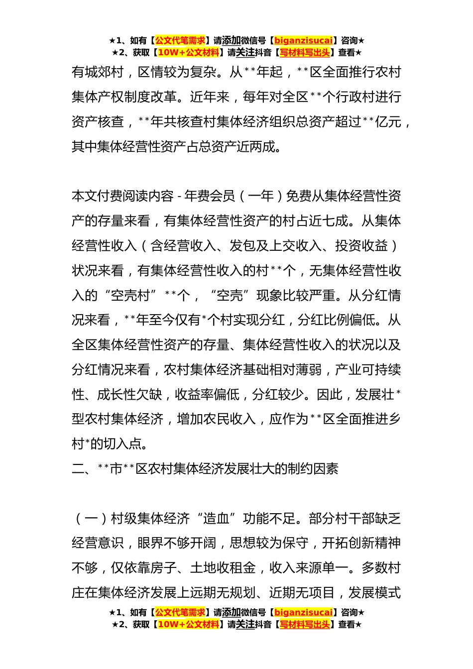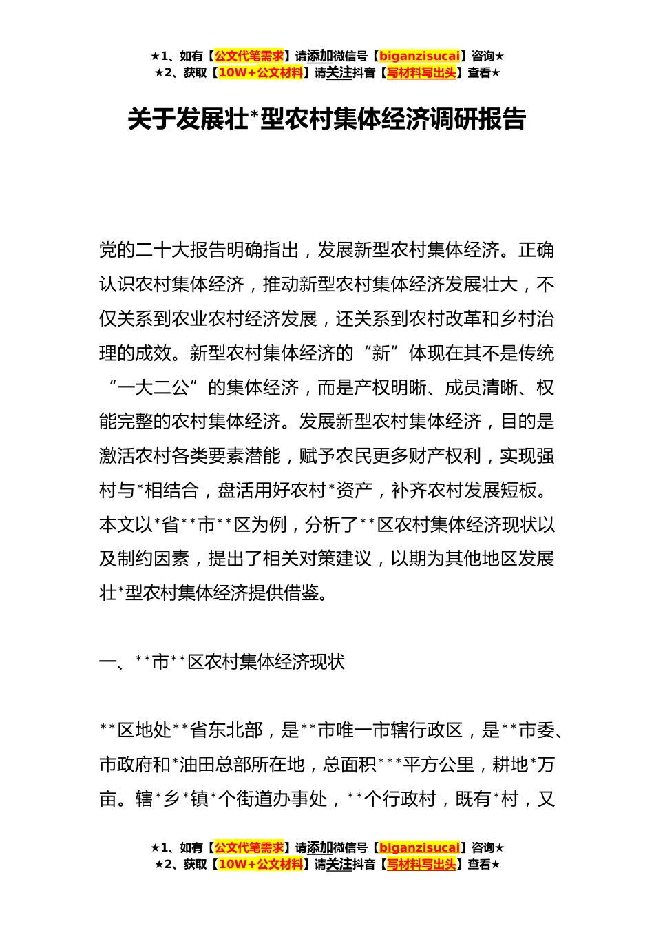 ★1、如有【公文代笔需求】请添加微信号【biganzisucai】咨询★★2、获取【10W+公文材料】请关注抖音【写材料写出头】查看★关于发展壮*型农村集体经济调研报告党的二十大报告明确指出,发展新型农村集体经济。正确认识农村集体经济,推动新型农村集体经济发展壮大,不仅关系到农业农村经济发展,还关系到农村改革和乡村治理的成效。新型农村集体经济的“新”体现在其不是传统“一大二公”的集体经济,而是产权明晰、成员清晰、权能完整的农村集体经济。发展新型农村集体经济,目的是激活农村各类要素潜能,赋予农民更多财产权利,实现强村与*相结合,盘活用好农村*资产,补齐农村发展短板。本文以*省**市**区为例,分析了**区农村集体经济现状以及制约因素,提出了相关对策建议,以期为其他地区发展壮*型农村集体...