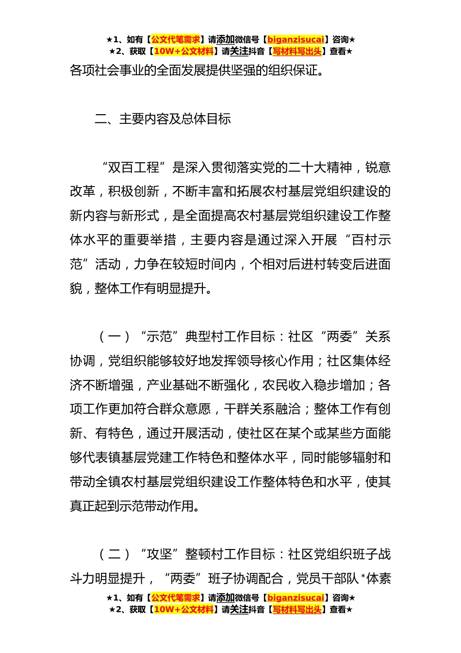 ★1、如有【公文代笔需求】请添加微信号【biganzisucai】咨询★★2、获取【10W+公文材料】请关注抖音【写材料写出头】查看★关于“百村示范”、“百村攻坚”活动实施方案为进一步深化社区党的建设“百村示范”、“百村攻坚”活动,全面提高我社区基层党组织建设工作水平,切实增强党总支部的创造力、凝聚力和战斗力,结合我社区实际,制定本实施方案。一、指导思想坚持以习近平新时代中国特色社会主义思想为指导,认真贯彻落实党的二十大精神,以深入开展社区党总支部的建设“百村示范”、“百村攻坚”活动为总抓手,大力实施以典型带动为主要内容的“示范”活动和以后进社区整顿提高为主要内容的“攻坚”活动,按照“五个好”村党组织的目标要求,不断提高社区基层党组织建设工作水平,切实把村级党组织建设成为...