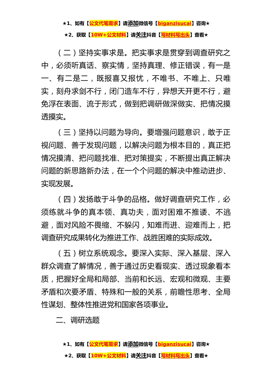 ★1、如有【公文代笔需求】请添加微信号【biganzisucai】咨询★★2、获取【10W+公文材料】请关注抖音【写材料写出头】查看★机关工委*调查研究之风工作实施方案根据中共中央办公厅《关于在全党*调查研究的工作方案》精神,为深刻认识调查研究的极端重要性,牢牢把握做好调查研究工作的基本原则、主要方式方法,推动党员干部深入开展调查研究,不断深化对党的创新理论的认识和把握,善于运用党的创新理论研究新情况、解决新问题、总结新经验、探索新规律,扑下身子干实事、谋实招、求实效,特制定本方案。一、总体要求“”党员干部要坚持调查研究是谋事之基,成事之道原则,深刻理解调查研究既是基本工作方法,也是推进各项工作的方法论,要聚焦调查研究,抓好贯彻落实,使调查研究工作同中心工作和决策需要紧密结...
