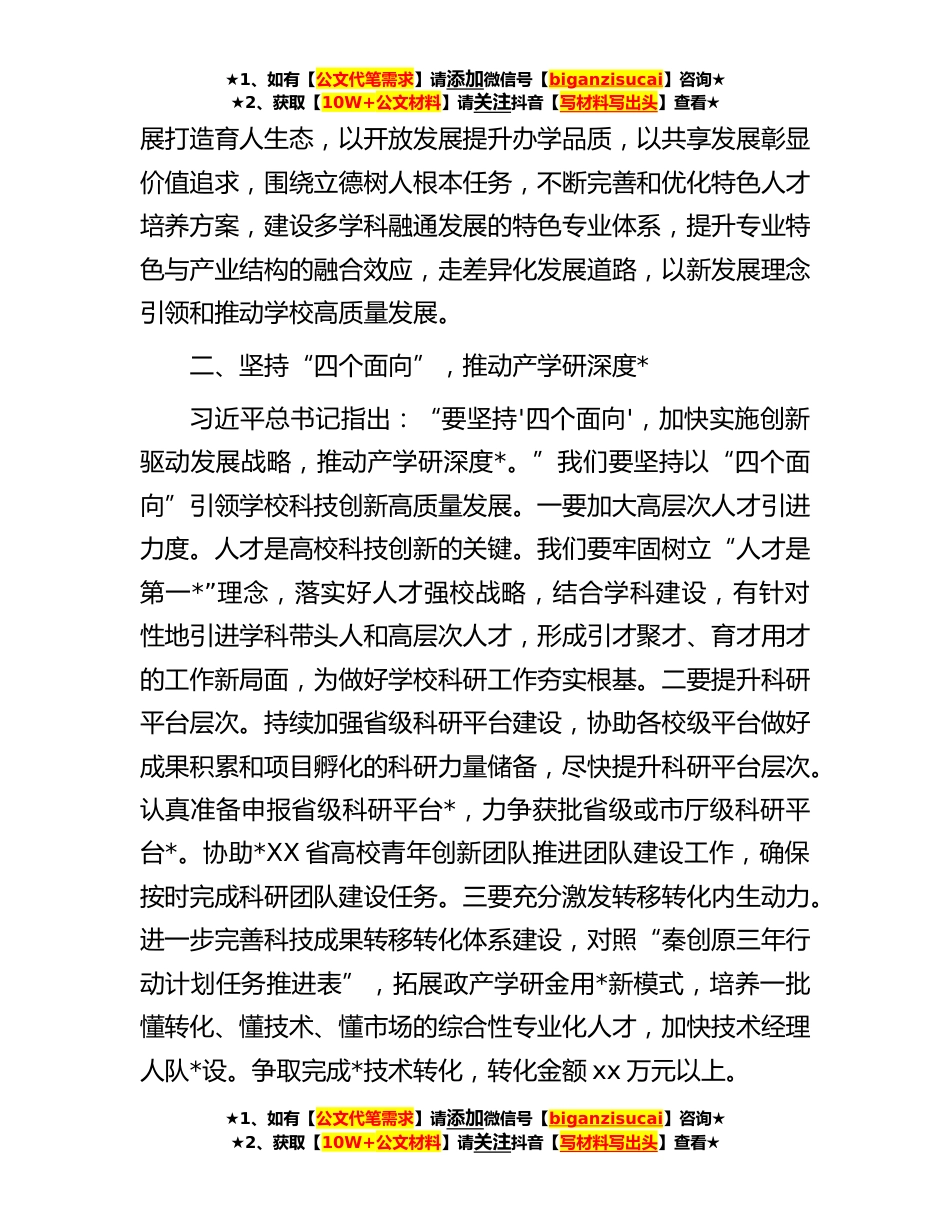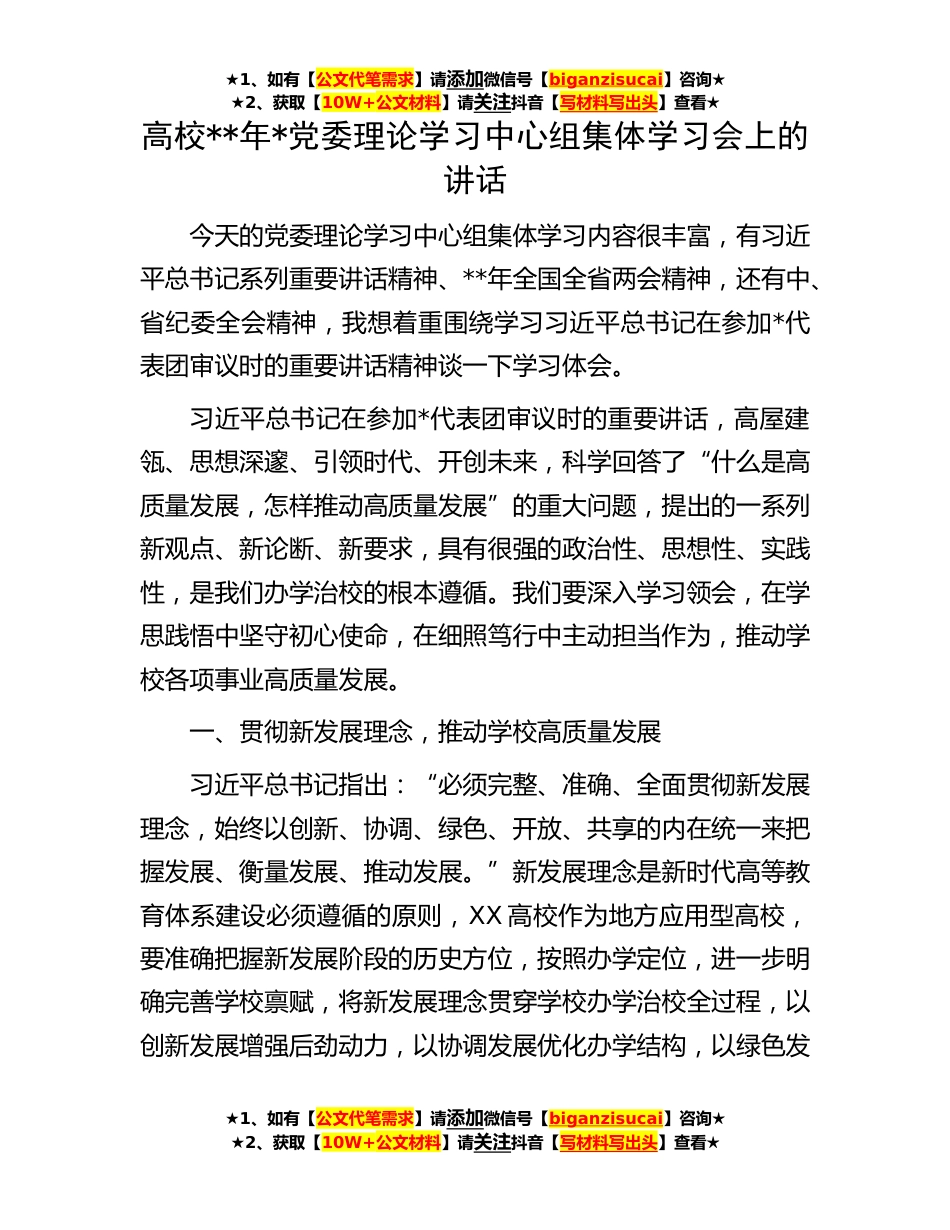★1、如有【公文代笔需求】请添加微信号【biganzisucai】咨询★★2、获取【10W+公文材料】请关注抖音【写材料写出头】查看★高校**年*党委理论学习中心组集体学习会上的讲话今天的党委理论学习中心组集体学习内容很丰富,有习近平总书记系列重要讲话精神、**年全国全省两会精神,还有中、省纪委全会精神,我想着重围绕学习习近平总书记在参加*代表团审议时的重要讲话精神谈一下学习体会。习近平总书记在参加*代表团审议时的重要讲话,高屋建瓴、思想深邃、引领时代、开创未来,科学回答了“什么是高质量发展,怎样推动高质量发展”的重大问题,提出的一系列新观点、新论断、新要求,具有很强的政治性、思想性、实践性,是我们办学治校的根本遵循。我们要深入学习领会,在学思践悟中坚守初心使命,在细照笃行中主动...