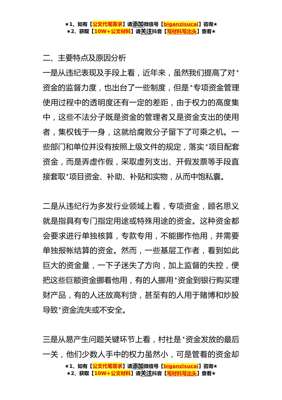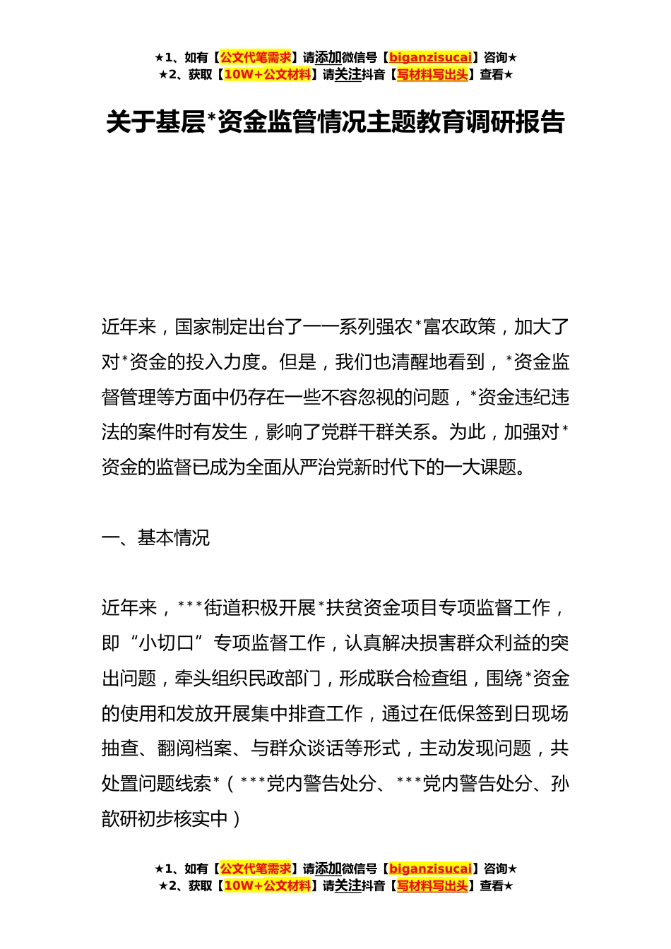 ★1、如有【公文代笔需求】请添加微信号【biganzisucai】咨询★★2、获取【10W+公文材料】请关注抖音【写材料写出头】查看★关于基层*资金监管情况主题教育调研报告近年来,国家制定出台了一一系列强农*富农政策,加大了对*资金的投入力度。但是,我们也清醒地看到,*资金监督管理等方面中仍存在一些不容忽视的问题,*资金违纪违法的案件时有发生,影响了党群干群关系。为此,加强对*资金的监督已成为全面从严治党新时代下的一大课题。一、基本情况近年来,***街道积极开展*扶贫资金项目专项监督工作,即“小切口”专项监督工作,认真解决损害群众利益的突出问题,牵头组织民政部门,形成联合检查组,围绕*资金的使用和发放开展集中排查工作,通过在低保签到日现场抽查、翻阅档案、与群众谈话等形式,主动发现问题...