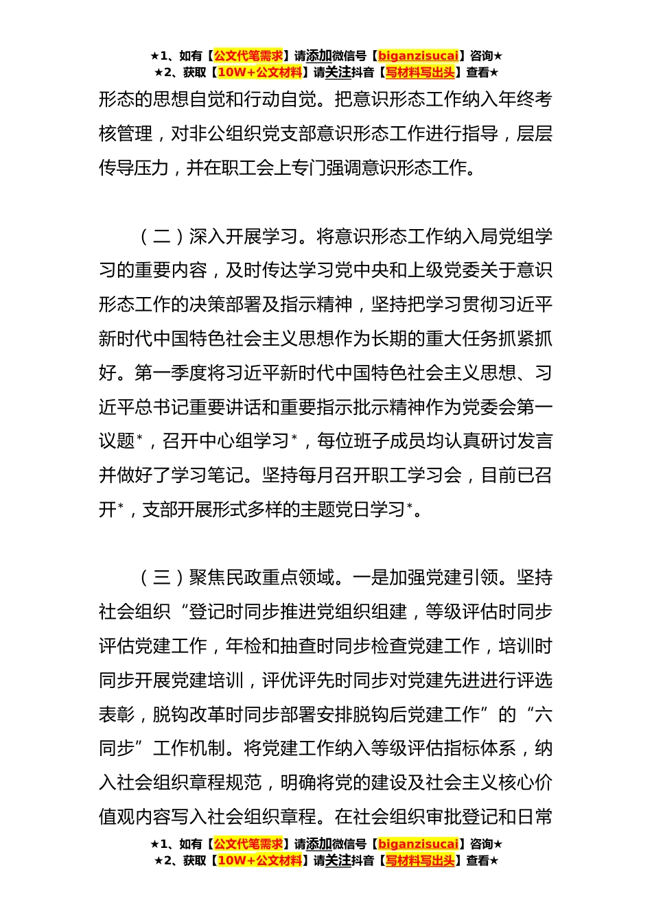 ★1、如有【公文代笔需求】请添加微信号【biganzisucai】咨询★★2、获取【10W+公文材料】请关注抖音【写材料写出头】查看★**年党组第一季度意识形态总结报告**年第一季度以来,在县委、县政府的坚强领导下,在县委宣传部的正确指导下,县民政局党组高度重视意识形态工作,认真贯彻落实习近平新时代中国特色社会主义思想和党的十九大精神,强化担当意识和责任意识,牢牢把握正确的政治方向,始终把意识形态工作贯穿于各项重点工作中,真正把意识形态工作落到实处。现将有关情况报告如下。一、开展意识形态工作的基本情况(一)强化组织领导。局党组认真学习贯彻习近平总书记关于意识形态工作的重要论述,严格落实《党委(党组)意识形态工作责任制实施办法》,切实增强抓意识形态工作的履职自觉。专题研判意识形...