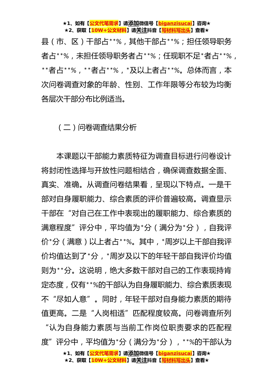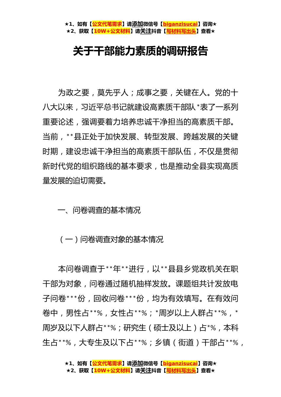 ★1、如有【公文代笔需求】请添加微信号【biganzisucai】咨询★★2、获取【10W+公文材料】请关注抖音【写材料写出头】查看★关于干部能力素质的调研报告为政之要,莫先乎人;成事之要,关键在人。党的十八大以来,习近平总书记就建设高素质干部队*表了一系列重要论述,强调要着力培养忠诚干净担当的高素质干部。当前,**县正处于加快发展、转型发展、跨越发展的关键时期,建设忠诚干净担当的高素质干部队伍,不仅是贯彻新时代党的组织路线的基本要求,也是推动全县实现高质量发展的迫切需要。一、问卷调查的基本情况(一)问卷调查对象的基本情况本问卷调查于**年**进行,以**县县乡党政机关在职干部为对象,问卷通过随机抽样发放。课题组共计发放电子问卷***份,回收问卷***份,均为有效填写。在有效问卷中,男性...