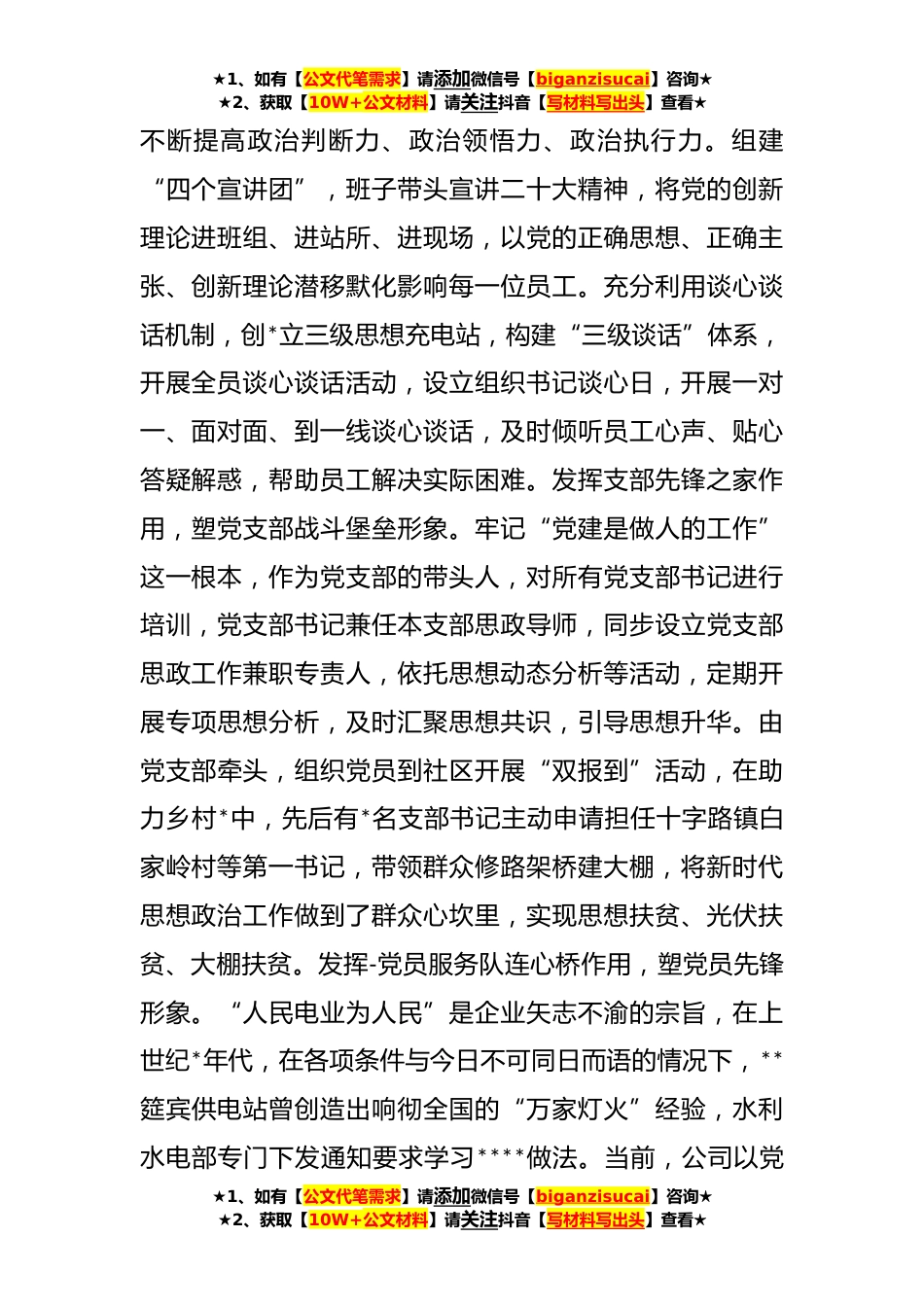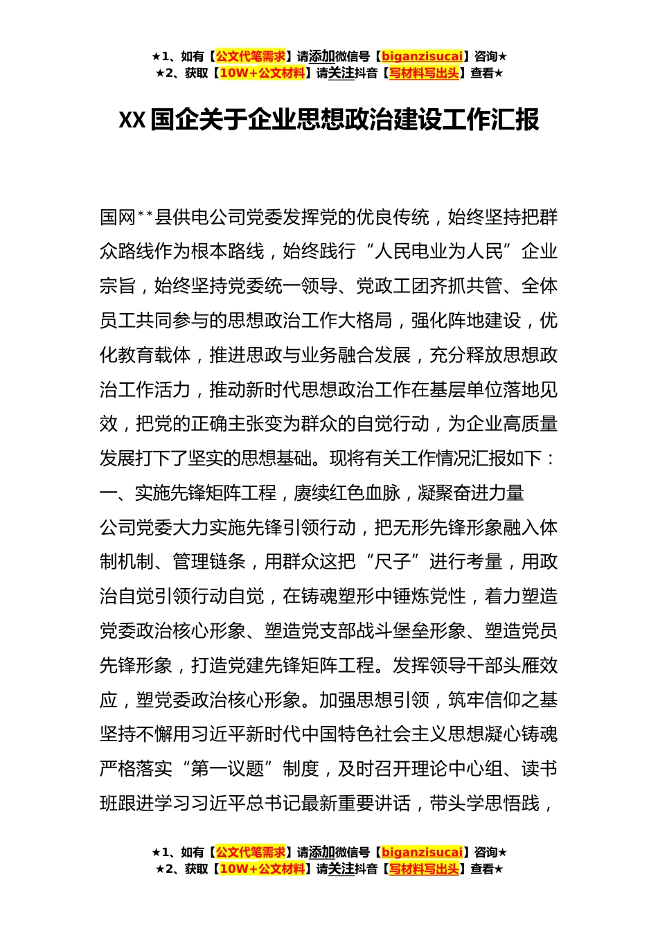 ★1、如有【公文代笔需求】请添加微信号【biganzisucai】咨询★★2、获取【10W+公文材料】请关注抖音【写材料写出头】查看★XX国企关于企业思想政治建设工作汇报国网**县供电公司党委发挥党的优良传统,始终坚持把群众路线作为根本路线,始终践行“人民电业为人民”企业宗旨,始终坚持党委统一领导、党政工团齐抓共管、全体员工共同参与的思想政治工作大格局,强化阵地建设,优化教育载体,推进思政与业务融合发展,充分释放思想政治工作活力,推动新时代思想政治工作在基层单位落地见效,把党的正确主张变为群众的自觉行动,为企业高质量发展打下了坚实的思想基础。现将有关工作情况汇报如下:一、实施先锋矩阵工程,赓续红色血脉,凝聚奋进力量公司党委大力实施先锋引领行动,把无形先锋形象融入体制机制、管理...